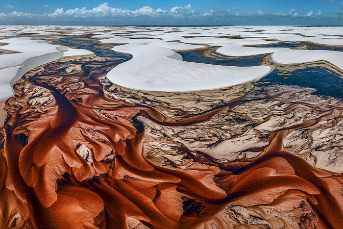 Привет, мои дорогие любители необычной природы Земли. Сегодня в нашем выпуске место настолько прекрасное, что кажется рукотворной картиной гениального художника, то ли абстракциониста, то ли сюрреалиста. Находится этот неземной пейзаж в солнечной Бразилии, на берегу Атлантического океана и создан он не рукой живописца и двумя реками – Парнаибой и Прегисасом, выносящими песок к берегу океана. Песок образует обширные дюны, достигающие высоты сорока метров. Длина береговой линии составляет около семидесяти километров, а общая площадь, которую занимает это чудо природы, превышает полторы тысячи квадратных километров. Внешне это место похоже на пустыню, так как песок постоянно перемещается, и растения не закрепляются на нём. Если бы не одно обстоятельство. В этом месте выпадают обильные осадки. Именно они образуют среди дюн очаровательные лагуны и озёра. Но как? Ведь вода должна была просочиться сквозь песок. Должна. Но ей мешает монолитное основание, сложенное из вулканических пород. Это м