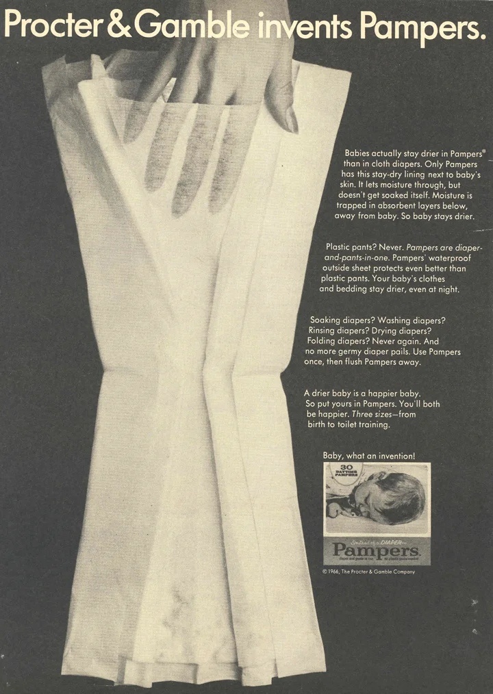 1950-е годы. США. Молодые родители погрязли в стирке. Марлевые подгузники кипятят, сушат, снова используют. Это бесконечный цикл, отнимающий силы и время. Инженер-химик Виктор Миллз на тот момент уже много лет успешно работал в Procter & Gamble. В молодости он был сварщиком и механиком, но, получив образование химика, устроился в P&G и совершил революцию в производстве мыла, сократив его изготовление с 7 дней до пары часов. Затем были смеси для выпечки, арахисовое масло, синтетический каучук. Всё улучшал, всё упрощал. Он ловко переносил инновационные решения из одной линейки продуктов в другую. Оставшись дома с тремя внуками, он столкнулся с проблемой многократного использования марлевых подгузников. Заботливый дед просто устал стирать. Его озарило: «Нужно не стирать, а выбрасывать!» И Миллз приступил к разработке подгузников. Первые прототипы 1959 года протекали, вызывали раздражение кожи. Испытания провалились. Мамы в тестовых группах отказались их использовать. Прорыв произошел в 1
