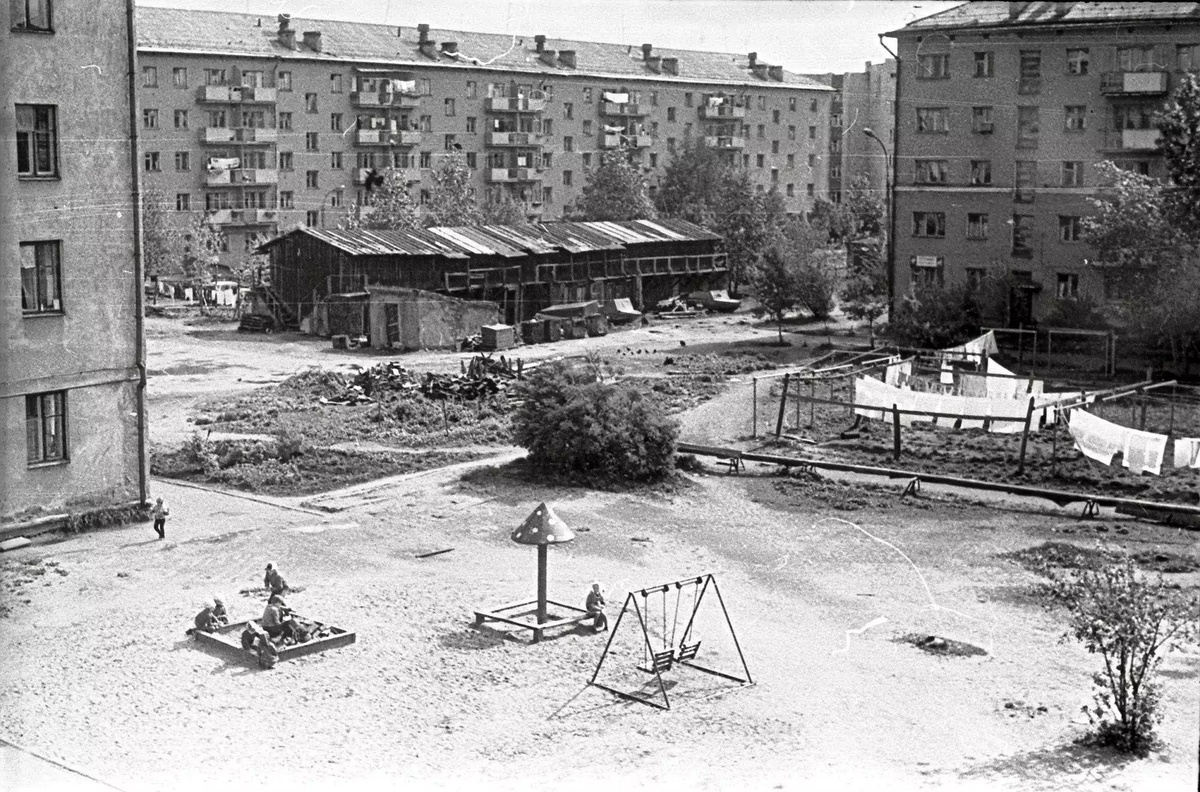 Обязательные атрибуты двора: детская площадка с качелями, песочницей и грибком; старые сарайки и развешанное на верёвках бельё.