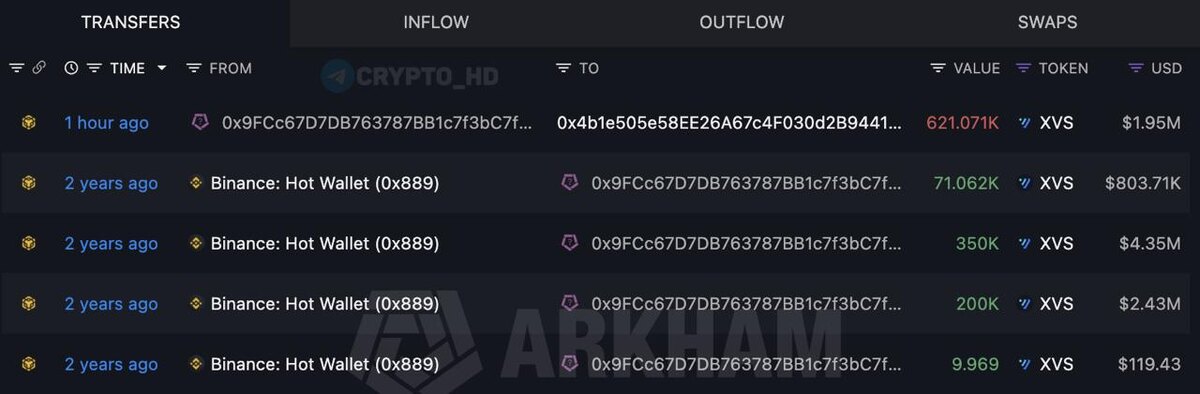 😭 Джастин Сан продал 621k XVS (Venus) за $1,95m с убытком ~$5,63m (-74%).