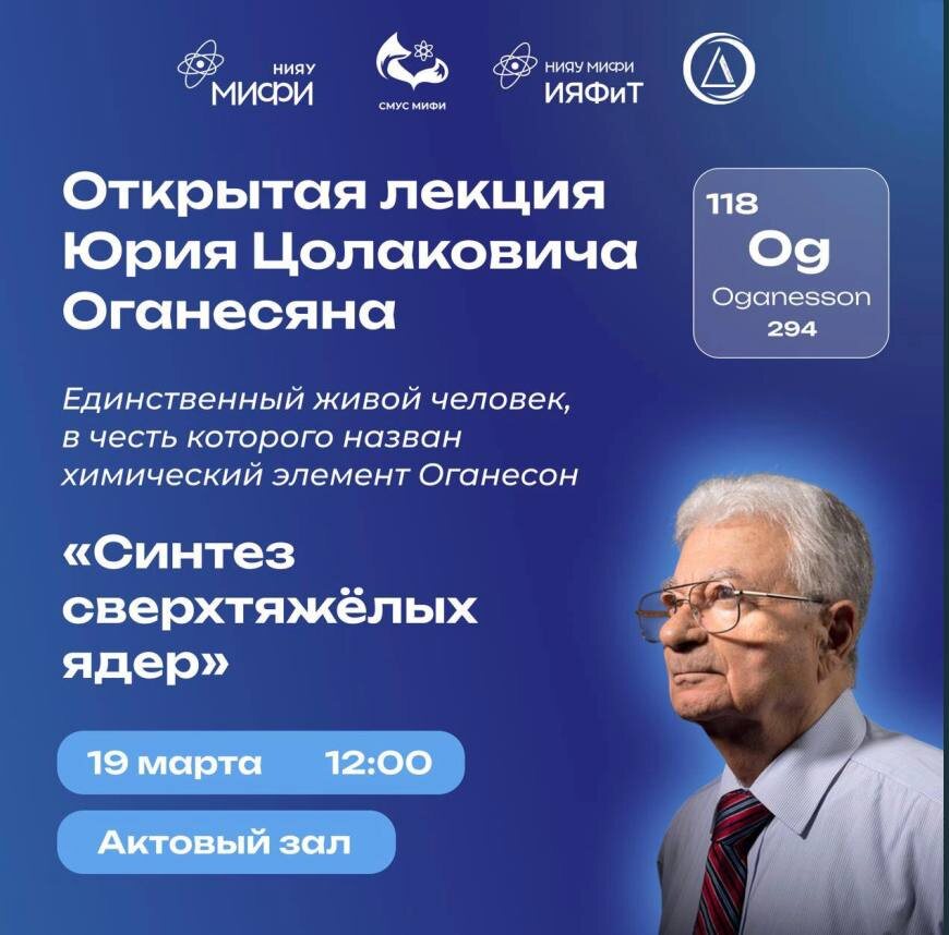 19 марта в 12:00 в Актовом зале НИЯУ МИФИ состоится лекция одного из самых выдающихся учёных современности — Юрия Цолаковича Оганесяна. Имя этого ученого навсегда вписано в Периодическую таблицу Менделеева: в его честь назван 118-й химический элемент — оганесон. Юрий Цолакович является единственным ныне живущим человеком, чьё имя носит химический элемент. Во время лекции Юрий Цолакович расскажет: • об истории Лаборатории ядерных реакций ОИЯИ; • о том, как синтезируют сверхтяжёлые элементы; • что представляет собой ядерная материя; • существует ли предел у Периодической таблицы Менделеева. Научная деятельность Юрия Оганесяна связана с Объединённым институтом ядерных исследований в Дубне. Вместе с Георгием Николаевичем Флёровым и коллегами здесь впервые в мире были синтезированы 11 химических элементов, что стало важнейшим вкладом в развитие мировой науки. 📡 Для тех, кто не сможет присутствовать лично, будет организована онлайн-трансляция лекции. Такие встречи происходят нечасто — не у