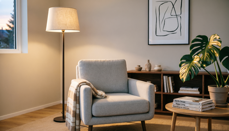 Беспроигрышный вариант. Мягкий свет, который не слепит. Идеален для спальни и гостиной. Секрет: выбирайте льняной или хлопковый абажур бежевого оттенка — получите тот самый «теплый бабушкин» свет, но в современном исполнении. 2. Торшер со столиком
