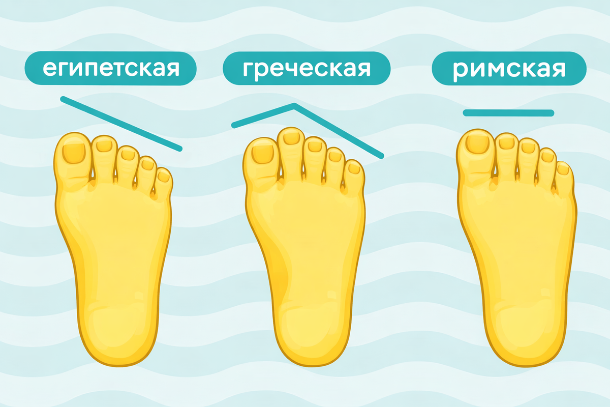 Рассмотрим детальнее каждый из них: 1. При египетском типе стопы 🦶 наиболее длинным является первый палец, далее следуют в порядке убывания второй, третий, четвертый и мизинец. Такой тип стопы в наибольшей степени склонен к поперечному плоскостопию, так как изменяется опорная точка первой плюсневой кости. Также такой тип стопы в наибольшей степени склонен к hallux valgus. 2. При греческом типе 🦶 стопы самым длинным является второй палец, при этом возможно развитие продольного плоскостопия. При таком варианте основную перегрузку испытывает пяточная кость. 3. При римском типе стопы 🦶 большой палец практически равен второму, а далее по убыванию. Такой тип стопы наиболее устойчив к заболеванию. Самый распространенный тип - это египетская стопа (50-70% населения), на втором месте "римская" стопа (30%) населения, самый редкий - греческий тип (20%). Давайте проверим так или это) А какой тип стопы у вас? Автор статьи - Бульбенова Ольга