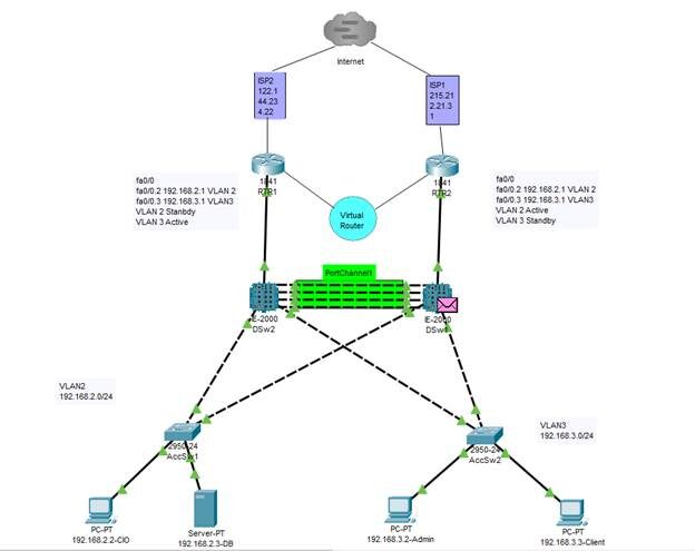 Наша сеть состоит из двух маршрутизаторов, двух коммутаторов распределения (DSw1, DSw2) и двух коммутаторов доступа (AccSw1, AccSw2). Маршрутизаторы RTR1 и RTR2 подключены к интернету, а коммутаторы доступа AccSw1 и AccSw2 обслуживают конечные устройства в VLAN 2 (192.168.2.0/24) и VLAN 3 (192.168.3.0/24) соответственно.