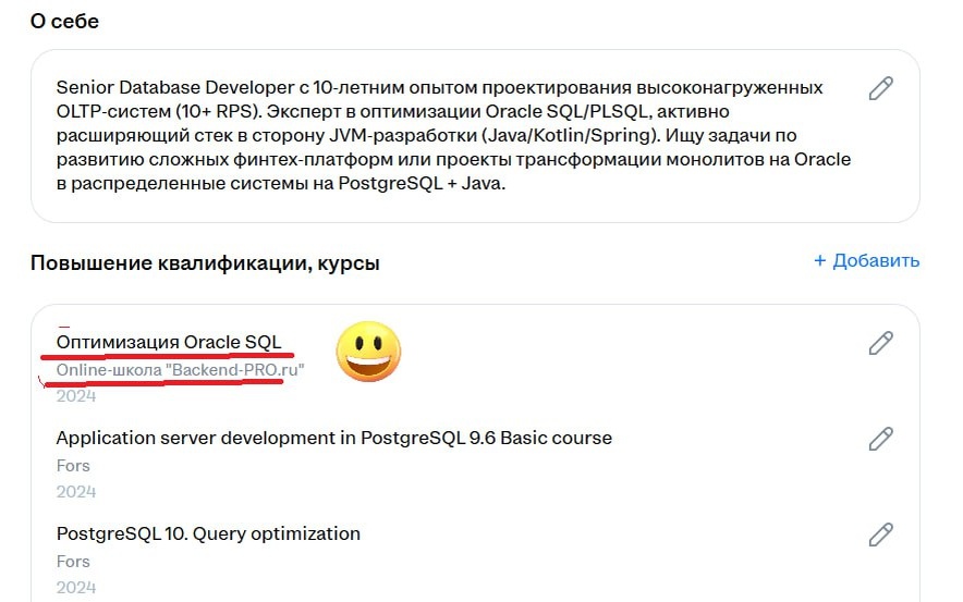 Старт поиска работы в текущих реалиях ⏳ 10 февраля, начало эксперимента Коллеги, всем привет! Денис на связи 🤜🏻🤛🏻 Мне говорили, что сейчас очень сложно устроиться на новую позицию Oracle Developer - кризис, рынок сужается, Oracle уходит и всё такое. В общем, я решил провести эксперимент и попробовать найти работу. Для тех кто недавно в канале. Я периодически, раз в год, выхожу на российский Оракловый рынок, чтобы понять, чего происходит, какие вопросы задают и т.п. Начало эксперимента 10 февраля в самый мертвый сезон я открыл своё фейковое резюме. Моё алтер-эго - это Senior Oracle Developer 10 лет работы. Работал в трех компаниях. Закончил несколько курсов, сменил три работы. Слегка потыкался в PG и Java/Kotlin. Ничего такого особенного. Средненький помидорчик. Залил CV в ИИшку, последовал советам и оформил CV на HH. Сейчас оно мне нравится больше чем то, что было. Завершил корпеть уже под вечер. Хочу сначала в пассивном режиме поискать. Не откликаясь. Выяснить, есть вообще с