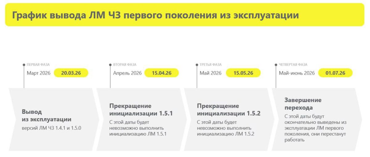 ) Старые версии Локального модуля (ниже 2.1.0) перестанут работать в 2026 году. Это связано с обновлением требований к продукту. Продление работы старых версий технически невозможно. Юридическое основание: пп. В п. 2.5 Открытой лицензии (обязанность Лицензиата устанавливать обновления). Что нужно сделать? Ориентируемся на версию ЛМ 2.1.0. 🔹 Если ваше кассовое ПО уже готово к работе с ЛМ 2.1.0 → ставьте сразу её. 🔹 Если нет → ставьте ЛМ 1.5.2, а позже, когда разработчик обновит ПО, перейдете на 2.1.0. Сроки (важно!): 🔹 До 20 марта 2026: работают версии 1.4.1 и 1.5.0. 🔹 С 20 марта 2026: версии 1.4.1 и 1.5.0 уйдут в ошибку (sync_error), офлайн не работают. 🔹 С 15 апреля 2026: нельзя будет запустить (инициализировать) версию 1.5.1. 🔹 С 15 мая 2026: нельзя будет запустить версию 1.5.2. 🔹 С 1 июля 2026: ПОЛНОЕ отключение версий 1.5.1 и 1.5.2 (ошибка, офлайн невозможен). Инициализация — это первый запуск/подключение модуля к системе. Не тяните до последнего, чтобы не создавать