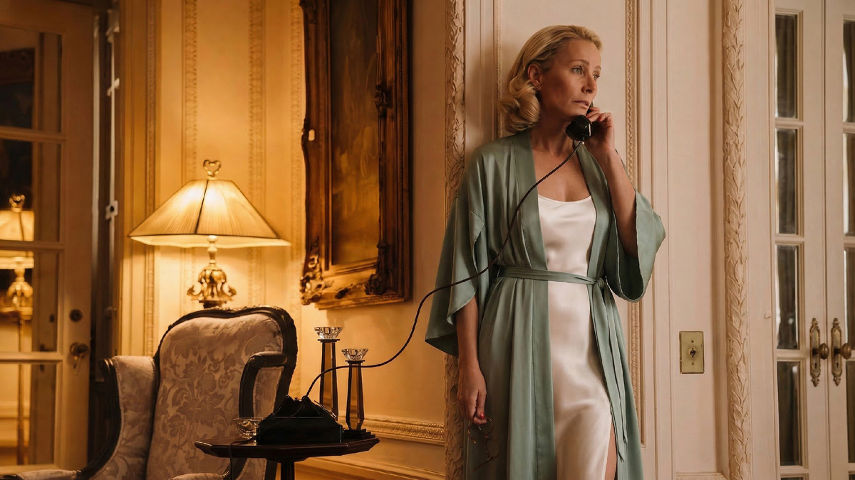 Композиция пространства фильма построена на классической эстетике: теплый свет, спокойные золотисто-бежевые оттенки, плотные ткани и благородные материалы. Интерьер выглядит камерным и закрытым, с тщательно продуманными деталями.