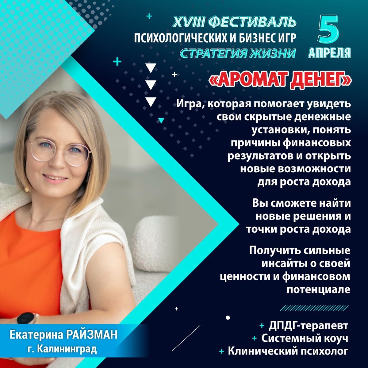 ». Это пространство, где через игровые форматы можно увидеть свои стратегии в жизни, отношениях и деньгах. В программе: 🎲 более 20 трансформационных игр 🎯 каждый участник проходит 3 игры на выбор 🤝 живое общение, новые знакомства и мощные инсайты Я тоже участвую как ведущая с игрой «Аромат денег». На игре вы сможете посмотреть на свои финансовые сценарии, увидеть ограничения и найти новые возможности для роста дохода. У меня есть 2 билета по специальной цене. Если чувствуете отклик — напишите мне в личные сообщения, и я расскажу все детали.