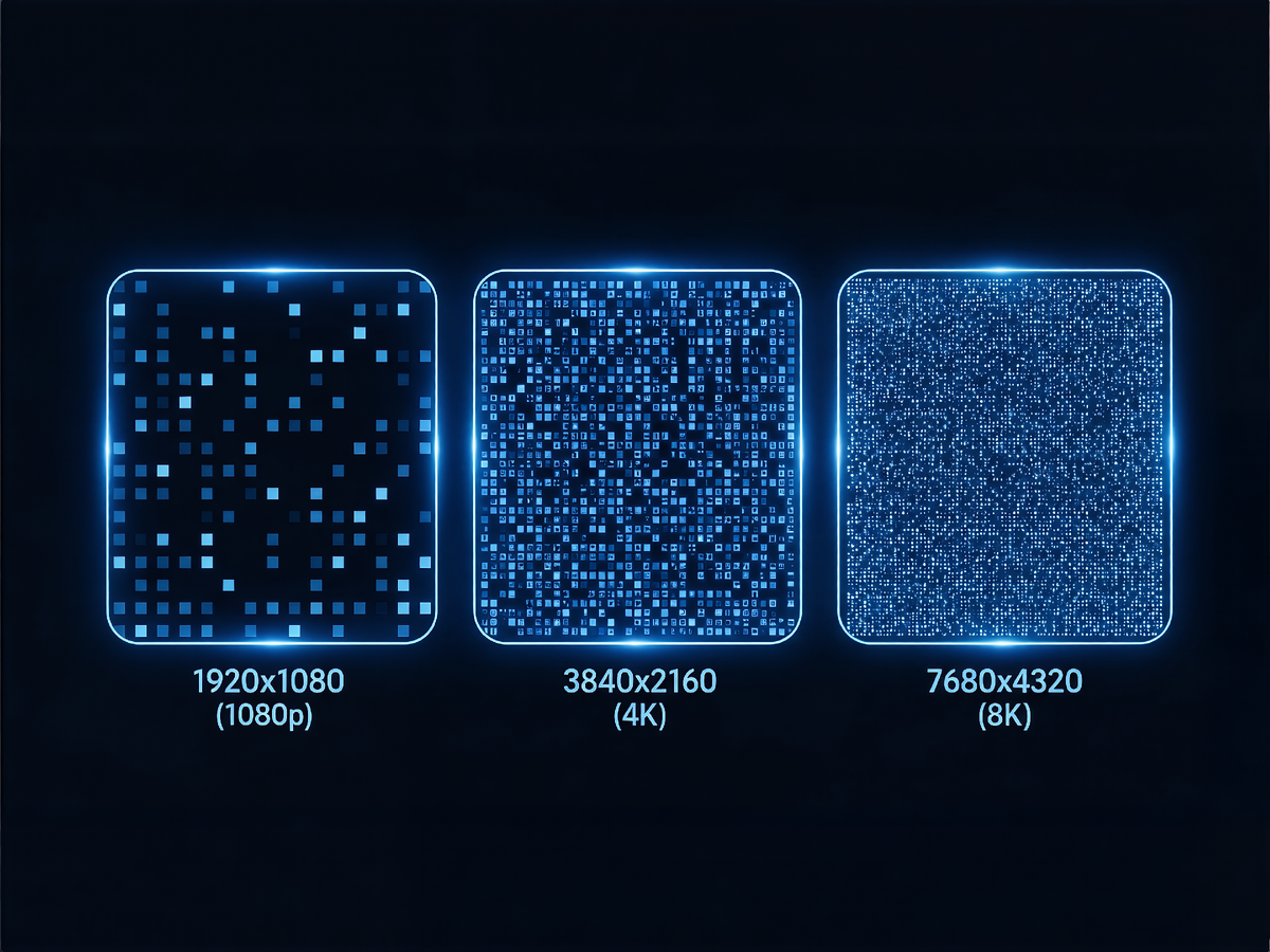8K: 7680×4320, общее количество пикселей — около 33,18 млн (в 4 раза больше, чем у 4K)