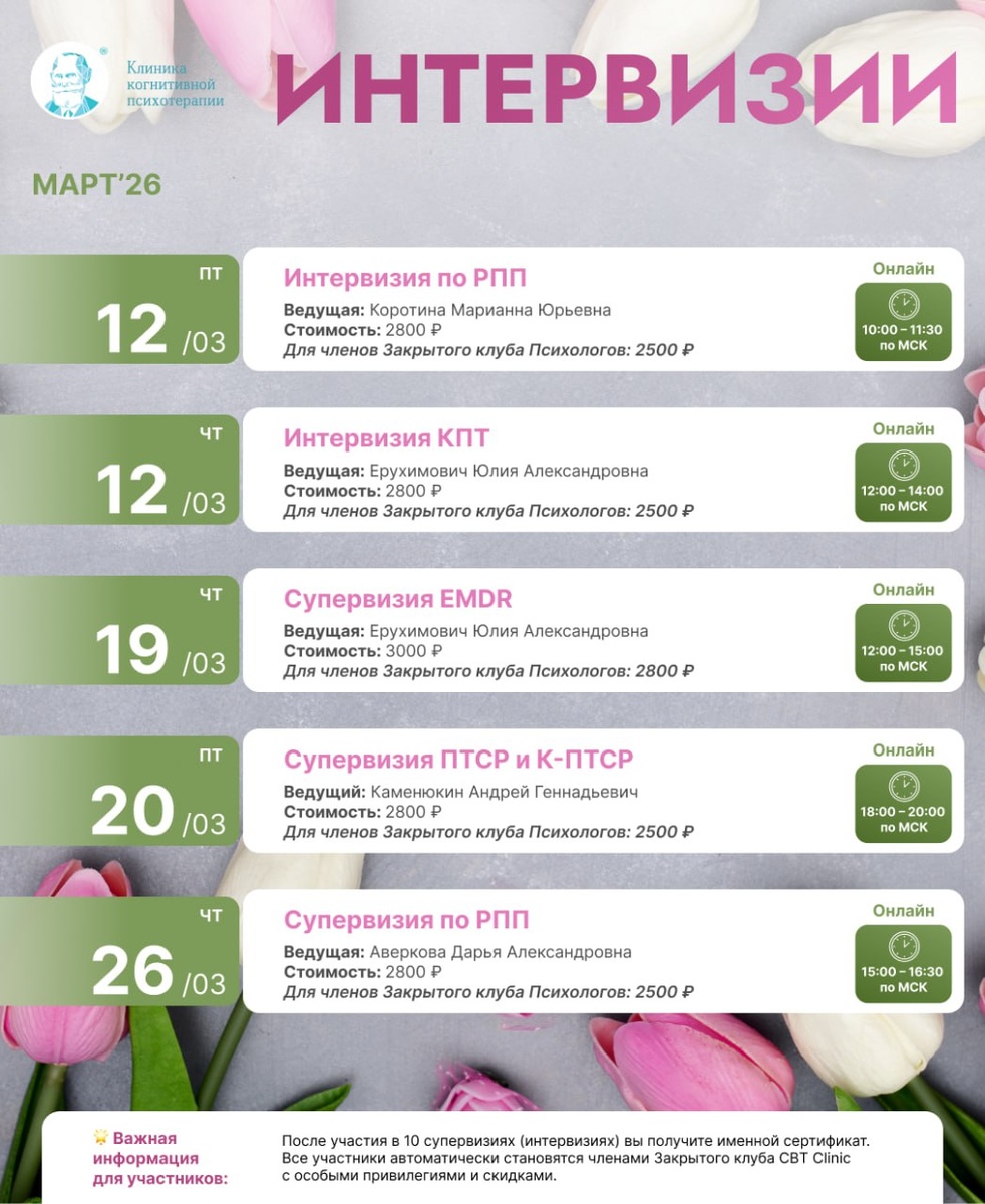 ! Групповые встречи для специалистов на этой неделе: 👀 Онлайн Супервизия EMDR Ведущая: Ерухимович Юлия Александровна Дата и время: 19 марта (чт), 12:00 – 15:00 по МСК Формат: Онлайн Стоимость: 3000 р. (2800 р. для участников Закрытого клуба) 📌 Онлайн Супервизия ПТСР и К-ПТСР Ведущий: Каменюкин Андрей Геннадьевич Дата и время: 20 марта (пт), 18:00 – 20:00 по МСК Формат: Онлайн Стоимость: 2800 р. (2500 р. для участников Закрытого клуба) 👉 Регистрация по ссылке