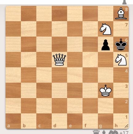 У черных пешка и король. У белых два коня, слон и ферзь. Автор задачи Г. Гниломедов, 1974 год. Ход белых, мат в 2 хода. Первый верный ход смотрите в галерее.
