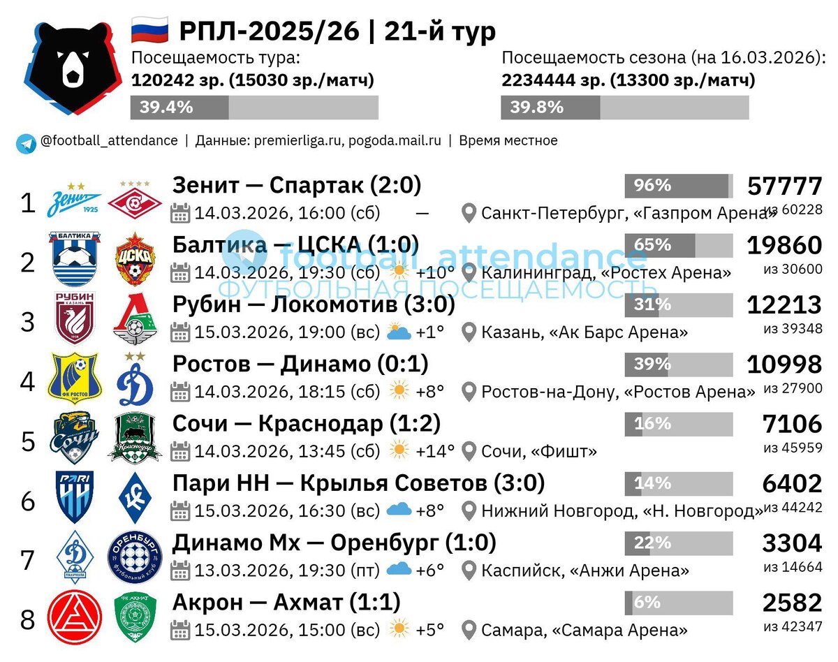 Матчи завершившегося тура премьер-лиги в сумме посетили 120242 человек, что в среднем составило 15030 зрителей на каждой игре. Это значение на 13% выше, чем среднее в сезоне (13300). Как я сообщал ранее, матч в Санкт-Петербурге стал не только самым посещаемым в туре и в РПЛ-2025/26, но и во всём российском футболе за два года со 2-го марта 2024 г. Подробности в отдельном посте. Матч с ЦСКА (19860) стал для «Балтики» третьим по количеству зрителей в этом сезоне РПЛ. Больше было только на встречах с «Зенитом» (27447) и «Локо» (21156). Встреча с «Краснодаром» (7106) стала для «Сочи» третьей по наибольшему числе болельщиков в текущем сезоне РПЛ. «Пари НН» собрал вторую по величине аудиторию (6402) в рамках РПЛ в Нижнем Новгороде на игре с «Крыльями». Больше было только на матче с «Зенитом» (7869). А рекорд сезона по посещаемости в Нижнем Новгороде был не в РПЛ, а в кубковом матче со «Спартаком» (14120). В итоге только две игры в туре из восьми собрали аудиторию выше среднего значения в сез
