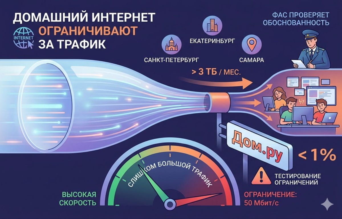 Дом.ру тестирует ограничение скорости проводного интернета в Санкт-Петербурге, Екатеринбурге и Самаре. Если один абонент использует более 3 ТБ трафика в месяц, скорость соединения сразу снижают до 50 Мбит/с. В компании утверждают, что мера затронет менее 1% пользователей и в основном касается тех, кто использует домашний интернет для коммерческих задач. Вернуть прежнюю скорость можно либо за дополнительную плату, либо после начала нового расчётного периода. Ситуацией уже заинтересовалась Федеральная антимонопольная служба России, которая проверит, насколько такие ограничения технически и в целом обоснованы. Весь выпускаемый здесь контент защищён авторским правом. Копирование и распространение материалов допускается только с указанием ссылки на источник. Уважайте труд правообладателя. 🤩 PRO NEWS: мы там где вы!