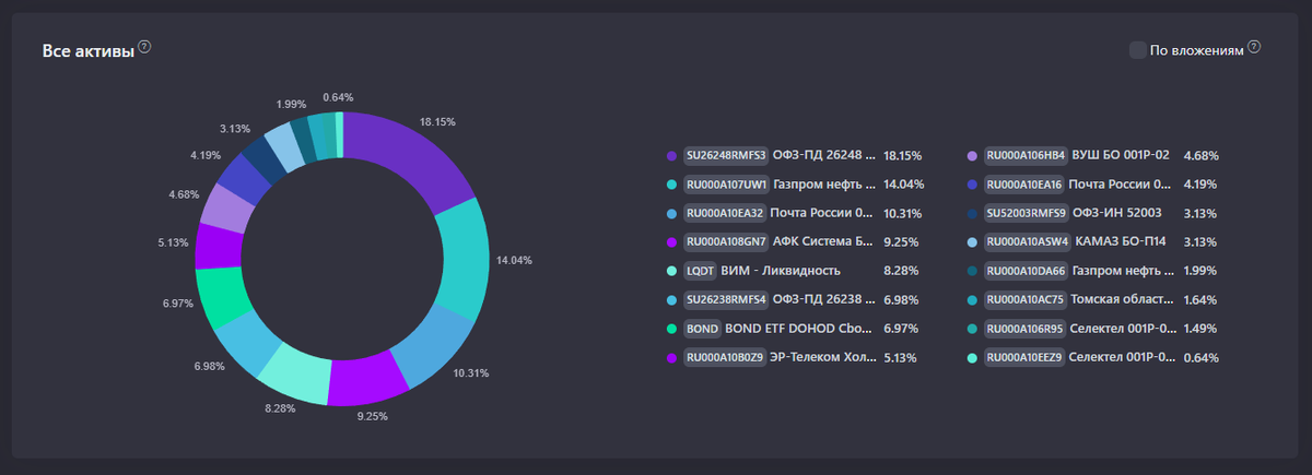 - Низкий риск - 26,7%: * ОФЗ-26248 - 18,1% * ОФЗ-26238 - 7,0% * Томская обл 34072 - 1,6% - Средний риск - 18,4%: * BOND ETF - 7,0% * ЭР-Тел 09 - 5,1% * Почта 3Р03 - 4,2% * Селектел 03 - 1,5% * Селектел 07 - 0,6% - Высокий риск - 4,7%: * ВУШ 02 - 4,7% - Низкий риск - 24,4%: * Газпромнефть 10R - 14,1% * LQDT - 8,3% * Газпромнефть 02R - 2% - Средний риск - 13,5%: * Почта 3Р04 - 10,3% * КАМАЗ 14 - 3,2% - Высокий риск - 9,2%: * Система Р30 - 9,2% - Низкий риск - 3,1%: * ОФЗ 52003 - 3,1%. Ковбойских, рисковых позиций мало, а точнее всего две. Вуш (объелся груш) - вообще не понимаю, как рынок прайсит даже минимальную вероятность проблем с погашением облигаций в июле этого года. Из-за чего ytm в этом выпуске уже 29%. Может, я чего-то не понимаю, и надо бежать? Поясните. Система - поразительно, но доходность флоатера на уровне КС+6,3%. Это доходность лютых ВДО, но это Система. Для тех, кто не понимает, о чем речь: компания-владелец МТС и OZON (и