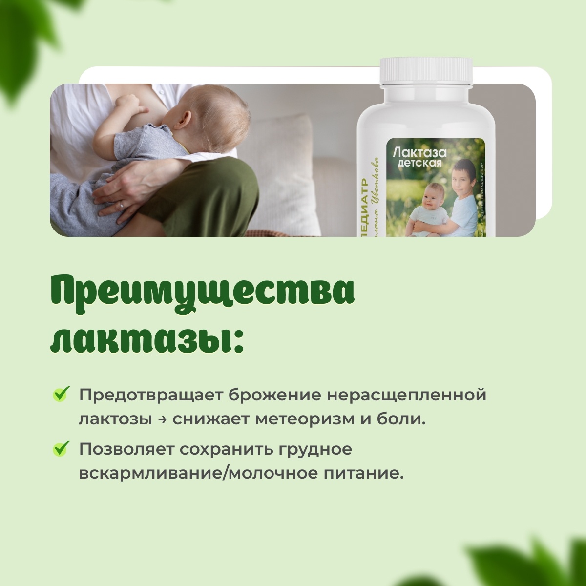 Вы дарите малышу самое ценное — грудное молоко. Но что делать, если после кормления ребёнок капризничает, плачет, мучается от колик и вздутия? Возможно, причина — во временной нехватке фермента лактазы. Лактазная недостаточность — частая проблема у малышей первых месяцев жизни. Из‑за нехватки фермента организм не до конца расщепляет лактозу (молочный сахар), и это вызывает дискомфорт в животике. Не спешите переходить на смеси! Есть более мягкий и безопасный способ помочь малышу — БАД «Лактаза детская» серии «Педиатр Светлана Цветкова». Почему мамы выбирают «Лактазу детскую»? 1. Сохраняет грудное вскармливание. Позволяет продолжить кормление грудью без перевода на специальные смеси. 2. Уменьшает колики и вздутие. Фермент помогает расщепить лактозу ещё до кормления — пищеварение становится легче. 3. Улучшает самочувствие малыша. Ребёнок спокойнее кушает, лучше спит и активнее набирает вес. 4. Безопасный состав. Разработан врачом-педиатром с учётом особенностей детского организма, без иск