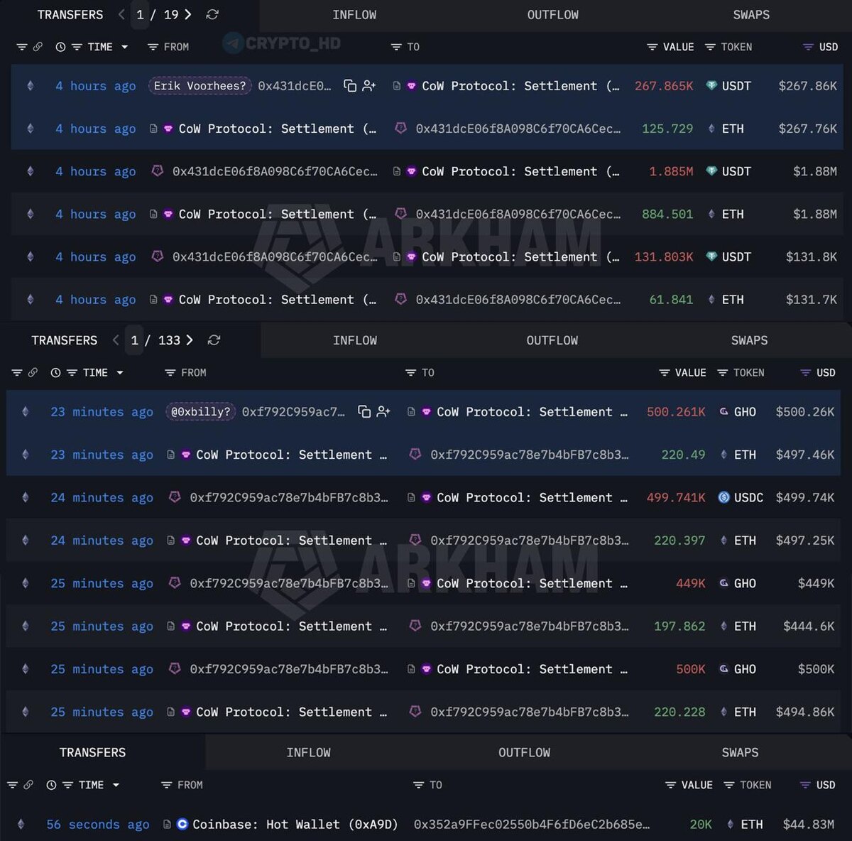 🐋 Киты активно покупают Ethereum. ➤ Ранний сторонник BTC и основатель ShapeShift Эрик Вурхиз потратил $49,08m, купив 23,393 ETH по средней цене ~$2098. ➤ Разработчик Ethereum «0xbilly» купил 7769 ETH $17,46m по средней цене ~$2248. ➤ Другой кит вывел 20,000 ETH ($44,83m) с биржи Coinbase на новый кошелек. Crypto Headlines