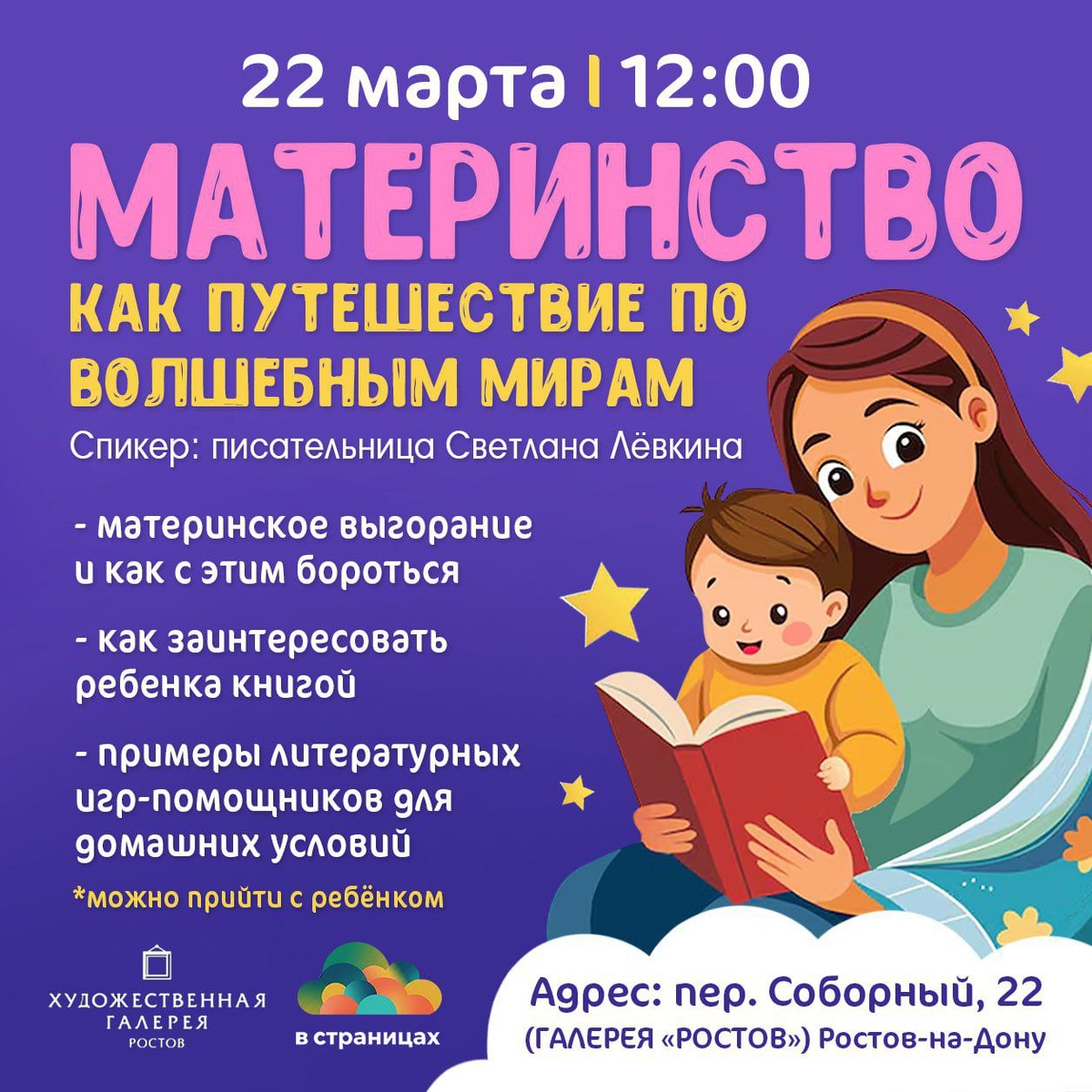 «Материнство, как путешествие по волшебным мирам». На встрече писательница, мама и резидент МКК "В СТРАНИЦАХ" Светлана Лёвкина расскажет: 🌼 О материнском выгорании и как с этим бороться; 🌸Материнство, как второй шанс вернуться в детство; 🌼 Способы заинтересовать ребенка книгой и заинтересоваться самому; 🌸Примеры литературных игр-помощников, которые можно провести в домашних условиях. 🌼В формате живого общения поговорим на актуальные темы в мире родительства. 🫶Можно прийти с детьми (мы приготовили для них карандаши и раскраски). 👍ЛОТЕРЕЯ - на встрече разыграем детские книги и аксессуары для мам. 🍫Маленьких гостей, пришедших с мамой, ждут шоколадки от книжного клуба «В СТРАНИЦАХ». 🗓 22 МАРТА ⏰12:00 📍 "ГАЛЕРЕЯ РОСТОВ" 🏠 пер. Соборный, дом 22 (Ростов-на-Дону) - Вход свободный - 🫠 Детские мероприятия Ростов-на-Дону. Я местный! 📲 Мероприятия Ростов-на-Дону. Я местный! в MAX