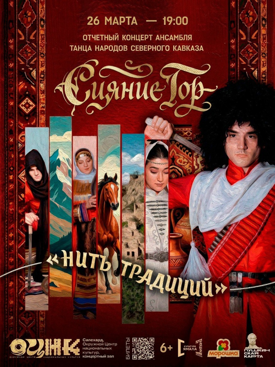 »! Ансамбль танца «Сияние Гор» и хореографическая группа «Лезгинка» приглашают вас на отчетный концерт «Нить традиций». Это шанс увидеть, как бережно хранят и передают культуру Северного Кавказа. Билеты доступны по ссылке: clck.ru/3Ru9PT по Пушкинской карте или через сервис «Морошка» со скидкой 20% До встречи 26 марта в 19:00 в Окружном Центре национальных культур! #ОЦНК #Салехард #КультураЯмала #СияниеГор