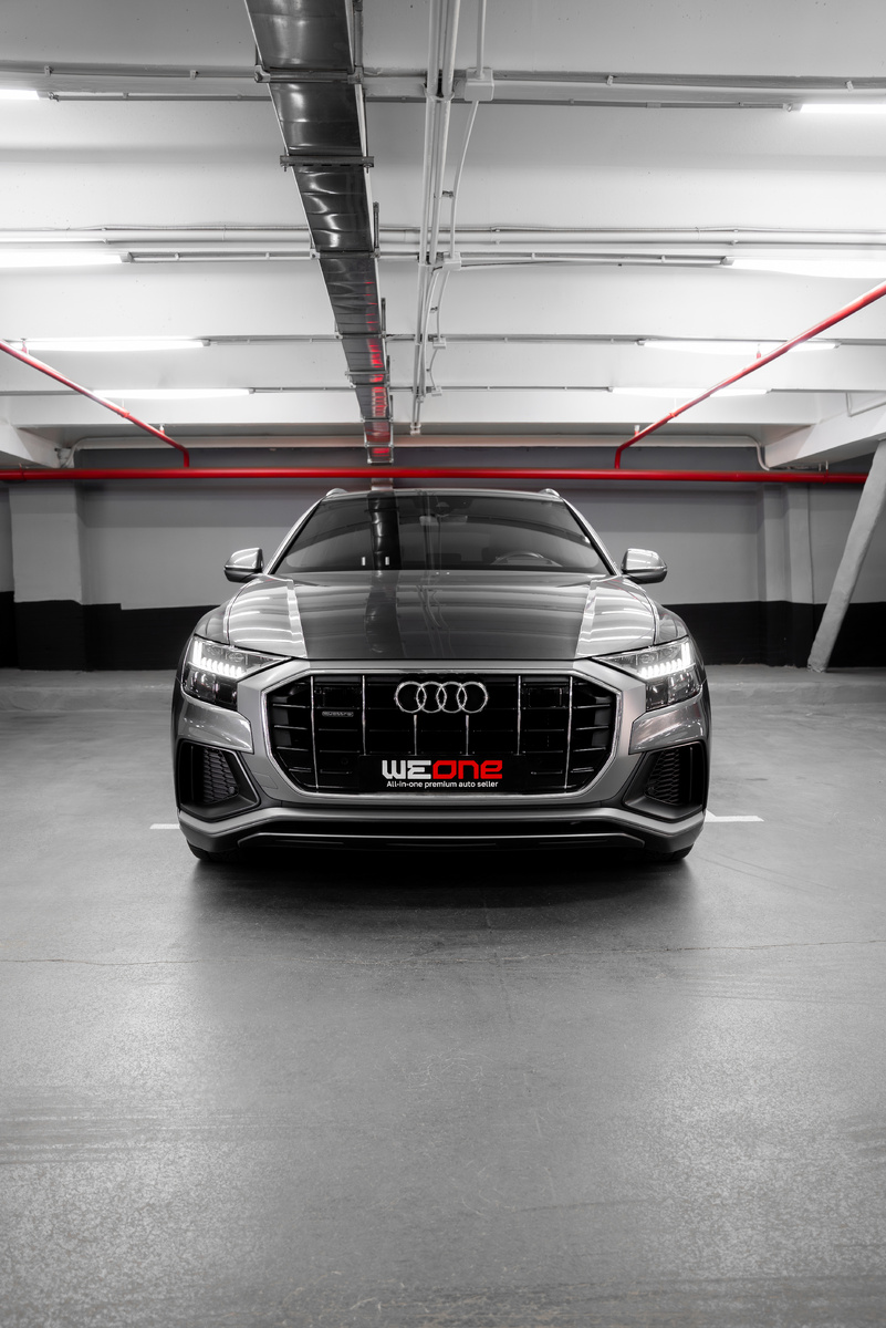 Audi представили Q8 в 2018 году, модель сразу позиционировалась как флагман линейки SUV марки. Инженеры хотели создать автомобиль, который объединит комфорт большого внедорожника и силуэт купе. Поэтому Q8 получил более агрессивный дизайн, широкую решетку радиатора и покатую линию крыши. Фактически именно с него началась новая дизайнерская философия современных Audi. Перед нами Audi Q8 2019 года, выпущенный в апреле. Пробег составляет 87.639 км. Цвет кузова — серый перламутр Daytona Grau, один из самых удачных оттенков для этой модели. Под капотом 3 л мотор мощностью 286 л.с. До 100 км/ч кроссовер разгоняется примерно за 6.3 с. Версия S-line добавляет внешнему виду спортивные акценты. 21-дюймовые диски, пневмоподвеска и система Audi Drive Select позволяют настроить автомобиль под настроение: от мягкого и комфортного до более собранного. Внутри комбинированный салон, спортивный руль, аудиосистема Bang & Olufsen с 3D-звуком, подогрев передних и задних сидений. Есть матричные фары, адапти