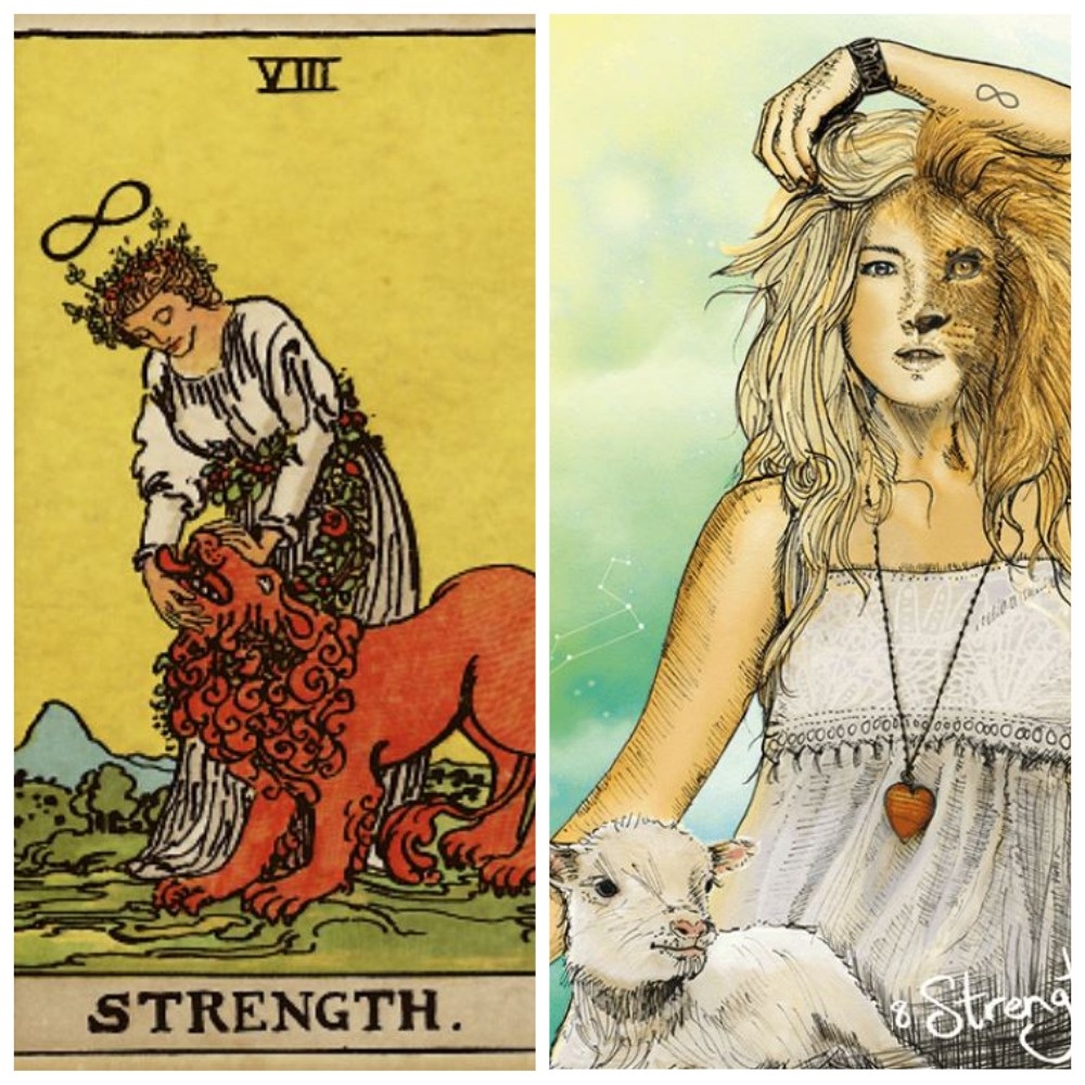 Символы Силы – женщина в белом платье, которая спокойно и уверенно укрощает льва. Над ее головой – знак бесконечности. Лев – это дикая природа, инстинкты, гнев, страсть, эго. Женщина символизирует терпение, любовь, выносливость и самоконтроль. Это контроль не авторитарный, это укрощение зверя через заботу, любовь и сострадание.