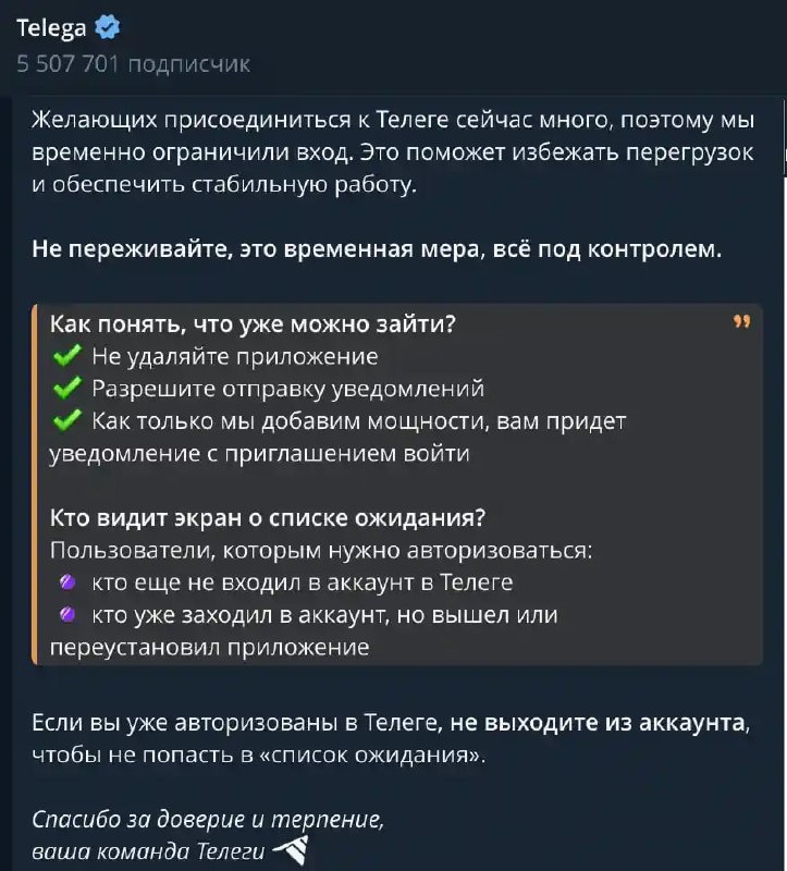 Telega сообщило о большом наплыве пользователей. Из-за этого разработчики временно ограничили авторизацию, объяснив это необходимостью стабильной работы. Мера является временной и направлена на предотвращение перегрузок системы. Пользователям рекомендуют не удалять приложение. Также нужно разрешить отправку уведомлений. После добавления мощностей всем ожидающим придёт уведомление с приглашением войти. Telega позиционирует себя как open-source форк клиента Telegram. Разрабатывает приложение компания под названием АО «Телега» (ранее она называлась АО «Даль»). 12 марта 2026 года издание Cnews сообщило, что приложение Telega получило 200 млн рублей от учредителей в 2025 году. #мессенджеры #Telega | Розыгрыши: Boosty, TG, MAX | | Telegram | VK | Сайт | MAX |
