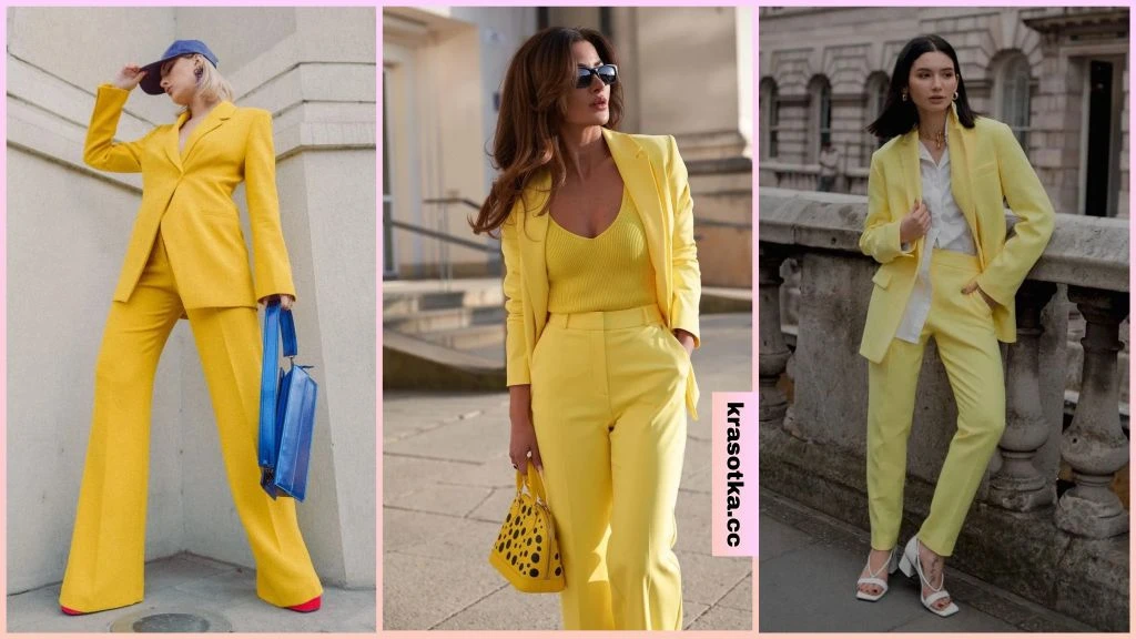 Многие женщины думают, что деловой костюм может быть только базовых цветов. Но есть модницы, которые выбирают необычные варианты классических комплектов. Желтый костюм — отличное решение для весны и лета. Если дресс-код позволяет, его можно надеть на работу. В нашей статье мы расскажем, как стильно носить желтый костюм и оставаться яркой леди. Желтый деловой костюм, состоящий из брюк и пиджака, можно выбрать для любого события в жизни. Этот элегантный комплект освежит и омолодит образ любой женщины. Носите его исключительно в стиле монохром или добавляйте детали в базовых оттенках. Читайте также: С чем носить желтый свитер и джемпер в [year] году: 45+ интересных идей Некоторые уверены, что желтый цвет нельзя назвать серьезным. На самом деле успешные леди уже давно разнообразили свой повседневный гардероб вещами в теплом солнечном цвете. А желтый костюм – это гарантия элегантного и яркого образа, который заставит каждого обернуться вам вслед. Этот костюм подойдет для летнего сезона. При