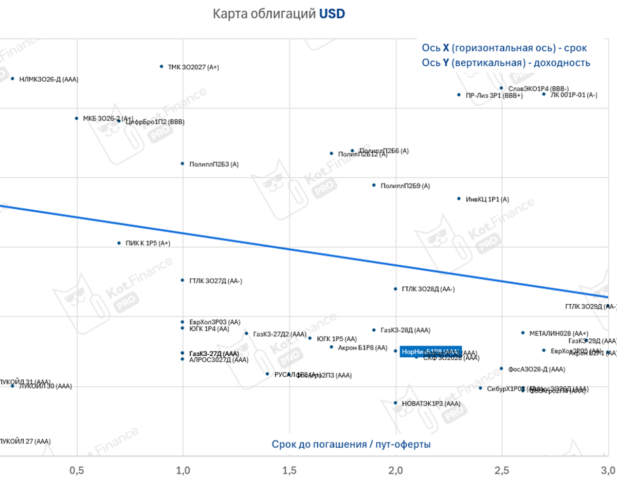 Оферты в облигациях бывают нормальными… А бывают такими (Черкизово -30%), такими (Сегежа -30%), или даже такими (ГТЛК -40%). Чтобы не получить одним днем -40% по счету мы придумали простое решение – 🗓Календарь оферт, чтобы никто не пропускал важные. Также мы ведем 🤬Black-list эмитентов, которые регулярно ставят нерыночные купоны (например 0,1% при ключевой ставке 17%). И напоминаем про то, что пора реинвестировать 😉 ГМК Норильский никель установил купон 7,75% в USD и котировки ушли выше номинала. Хорошие практики и удобство для инвесторов. Те, кто сидит давно могут получить право на ЛДВ 👉Наши обзоры: МГКЛ, Оил Ресурс, АФК Система, Самолёт, Монополия, Евротранс и другие ГМК НОРИЛЬСКИЙ НИКЕЛЬ-БО-001Р-08-USD ISIN: RU000A10B4K3 Ставка после оферты: 7,75%, купон ежемесячный Следующая оферта через 2 года Итого: Хорошая доходность на 2 года в ААА сегменте в USD. После публикации купона, цена ушла выше номинала и подавать на оферту стало невыгодно – проще выйти через стакан. Отличный пр