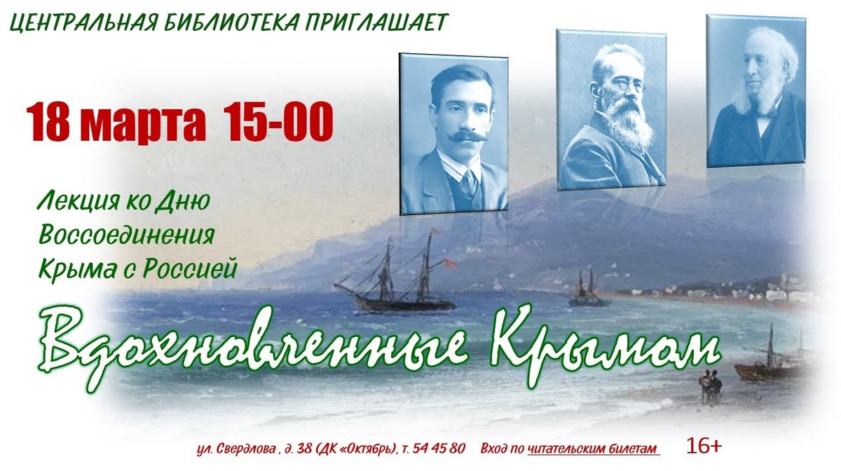 ✨ Лекция ко Дню воссоединения Крыма с Россией 👉Расскажем о некоторых из великих людей, чья судьба переплелась с Крымом - о писателе Александре Грине, композиторе Николае Римском-Корсакове и художнике Иване Айвазовском. ❗Вход по читательским билетам 🚫 Возраст: 16+ 📆 18.03.2026 🕒 15:00 🏢 Центральная библиотека 📍 г. Подольск, ул. Свердлова, д. 38 ⭐Поддержать канал голосом 🍰Где поесть в Подольске ✅ Мероприятия Подольск https://dzen.ru/id/66ed500f7b5671493eca3fd6 https://vk.ru/podolsk_events http://dzen.ru/podolsk_events