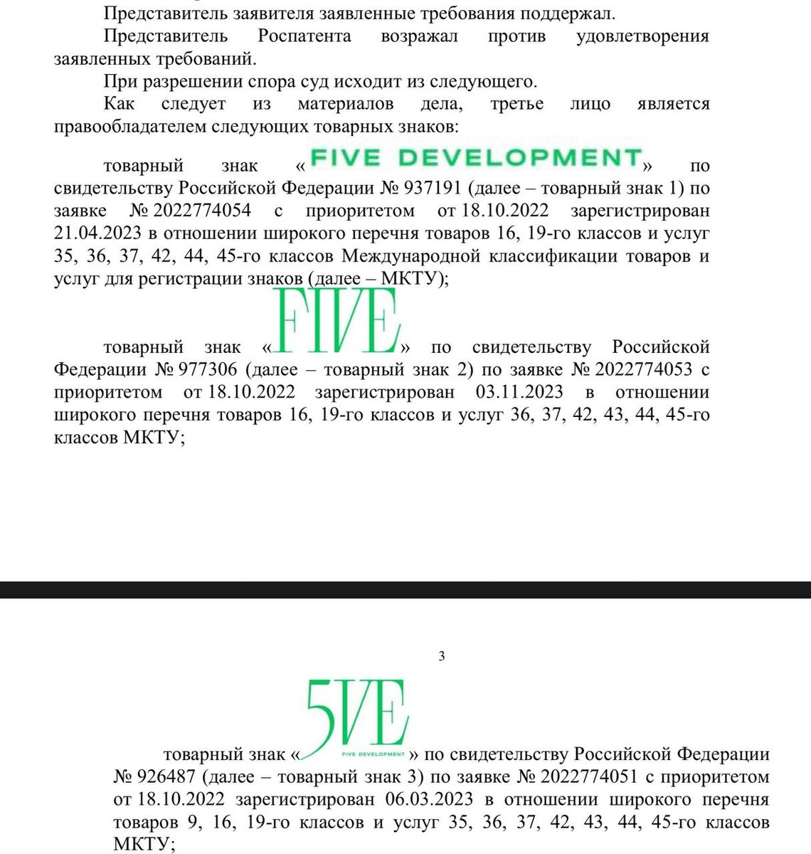 ООО «СОЮЗ» Максима Блажко оспаривало решения Роспатента, который отказался отменять регистрацию товарных знаков, принадлежащих ООО «5 Девелопмент» (в структуре «Мантера групп»). «СОЮЗ» считал, что знаки с элементом «FIVE» («пять») не должны охраняться, потому что это просто указание на число и такие обозначения не имеют различительной способности. Суд отказал в требованиях. Он согласился с Роспатентом, что слово «FIVE» — это не цифра, а словесное обозначение, которое может быть товарным знаком. Поэтому спорные знаки признаны обладающими различительной способностью и остаются действительными. 🔺Треугольный метр: На сайте | в MAX | Telegram | ВКонтакте | Дзен