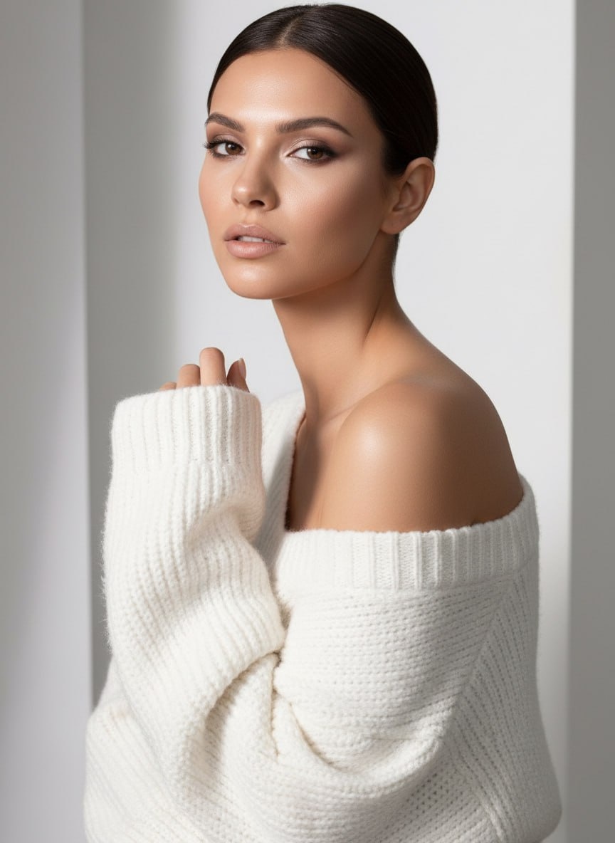Хватит «пластиковых» лиц и нейросетевых улучшалок! Этот промпт работает как точный перенос твоей внешности в стильный студийный кадр. Сохраняем структуру лица, взгляд и даже текстуру кожи без искажений. 🗿🔥 --- Используя загруженное селфи в качестве точного эталона лица со 100-процентным совпадением (--face_fidelity 1.0), создайте фотографию по описанию, сохранив полное сходство с оригиналом. Высококачественный динамичный [студийный портрет] женщины. [Асимметричная композиция, лицо в левой трети кадра, голова слегка наклонена, взгляд прямо в камеру, одна рука мягко касается края свитера у шеи]. Одежда: [объемный белый свитер крупной вязки, спущенный с одного плеча, подчеркивающий ключицы]. Фон: [минималистичный белый фон с легким градиентом]. Освещение: [мягкое кинематографичное студийное освещение, рассеянный свет слева]. Объектив 85 мм, малая глубина резкости, резкость на глазах, фотореализм, 8k. --- КАК МЕНЯТЬ 👀 🎯 Ракурс / Поза (замени [асимметричная композиция...]): — [круп