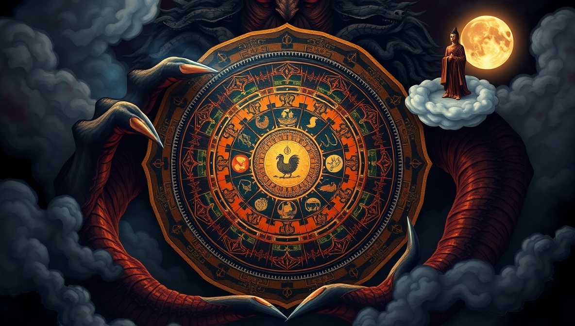 В центре колеса, в его ступице, находятся три главных яда, три корня всех наших бед, три животных, которые никогда не дают нам покоя. Это свинья, петух и змея, кусающие друг друга за хвосты. Свинья символизирует неведение и невежество, тот самый первородный мрак, из-за которого мы не видим истинной природы реальности. Петух олицетворяет страстную привязанность, жажду, похоть и желание, которое никогда не может быть полностью утолено. Змея же является символом гнева, отвращения и ненависти, которые возникают, когда наши желания наталкиваются на препятствия. Эти три силы вращают колесо бытия, они являются тем топливом, которое поддерживает бесконечный цикл страданий. И именно они вызывают самое сильное желание защититься, ведь каждый человек может обнаружить их в глубине собственного сердца.