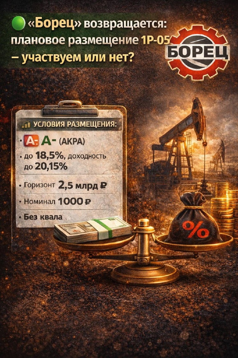 ? #борец Ещё год назад мало кто ставил на возвращение «Борца» на публичный рынок долга - эмитент переживал технический дефолт и серьёзную репутационную турбулентность. 👉 Переход под крыло государственной структуры переписал кредитный профиль эмитента. Теперь «Борец» - это не просто машиностроительный завод, а актив со стратегическим статусом. Однако вопрос о том, достаточно ли господдержки для полного закрытия накопленных долговых проблем, по-прежнему остаётся дискуссионным. Спрос на продукцию структурно обеспечен нефтяной отраслью - и это один из главных козырей инвестиционного кейса. 📋 Условия размещения Компания решила изначально выходить с двумя траншами одновременно, рассчитанными на разные категории участников рынка. ⚠️ Однако впоследствии второй выпуск (06) был перенесен на неопределенный срок. 🟢 Борец 001Р-05 *️⃣Кредитный рейтинг: 🅰️- (АКРА, прогноз «Стабильный») *️⃣Совокупный объём:2,5 млрд руб. *️⃣Горизонт инвестиций: 3 года *️⃣Ставка купона: 18,5% *️⃣Эффективная дох