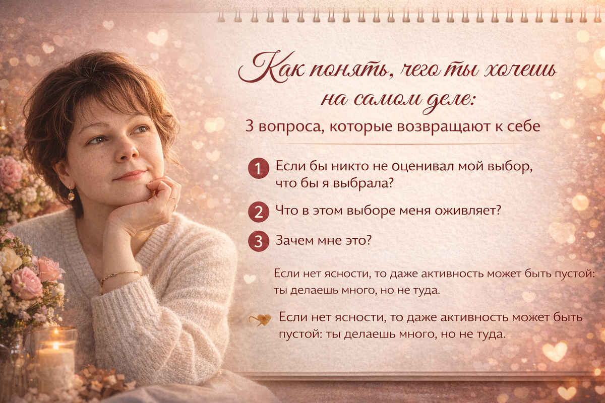 Этот вопрос помогает убрать социальный шум и услышать себя. Не «что подумают мама, муж, подруги, коллеги», а что на самом деле откликается тебе.