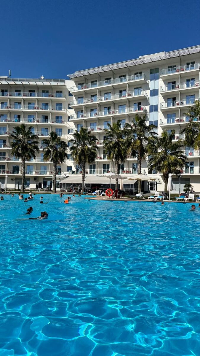 Огромнейшая территория, закрытая, несколько входов-выходов, на всех стоит охрана и пропускная система. Без ваучера на заселение вероятнее всего не пустят. 12 корпусов, мы жили в девятом, 7 этаж, номер стандарт. Все очень простенько, но на фотках их сайта как-то хуже выглядит, чем есть в реальности. При заселении уточнили номер с душем или ванной, учли пожелание вида на горы и две раздельные кровати. Меня все более, чем устроило. Заселились, разобрали вещи и пошли изучать территорию отеля. Погода нас встретила прохладно, был ветер, периодически небольшой. На территории несколько бассейнов, работал только один, подогреваемый, есть целый список развлечений, которые можно посещать в течение дня - зарядка, йога, водная аэробика, активности для детей, возле бассейна утром аниматоры, вечером на сцене. В общем даже если не собираетесь выходить за пределы отеля, найдется чем себя занять. Сначала нам показалось, что люлей мало, но это показалось. На ужине мы поняли, что очень даже много
