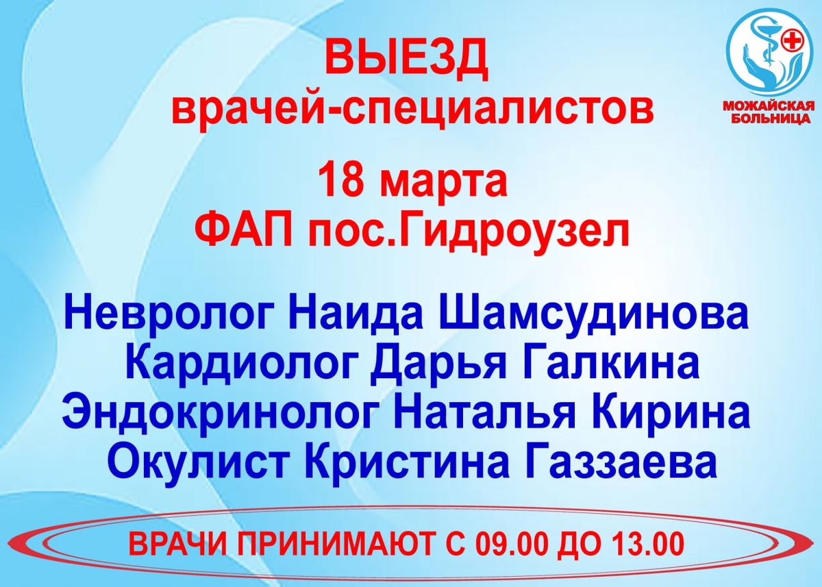 18 марта в ФАПе поселка ГИДРОУЗЕЛ жителей обследуют и дадут рекомендации врачи-специалисты Можайской больницы