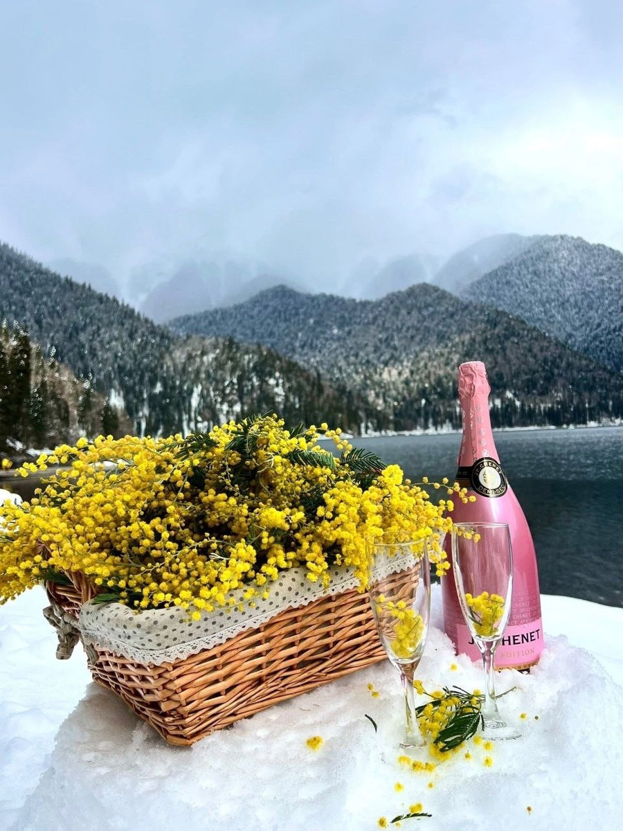 Снег и желтые веточки мимозы - волшебная красота🥹