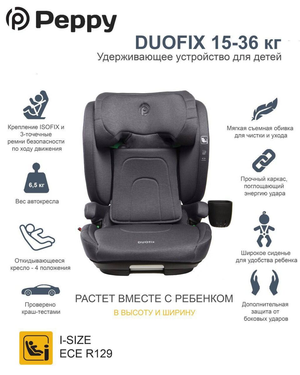 Peppy Duofix Оно растет вместе с ребенком и в высоту и самое главное в ширину. И хорошо защищает подросшего ребенка в том числе при боковом ударе. В комплектации к креслу идет: ✅ подстаканник, ✅ подушечка под поясницу ✅ плечевой ремень-накладка для мягкого натяжения ремня безопасности и комфорта ребенка. Стоимость 15500руб