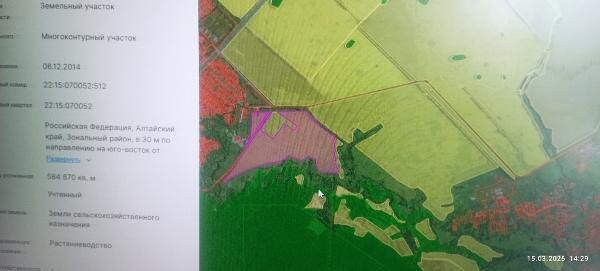 м, с кадастровым номером 22:15:070052:512, местоположение: Российская Федерация, Алтайский край, Зональный район, в 30 м по направлению на юго-восток от границы с. Соколово, вид разрешенного использования: растениеводство, сроком аренды: 7 (Семь) лет Канал: Госземля Алтайский край Область: край Алтайский Район: м.о. Зональный район Населенный пункт: с. Зональное Локация: Смотреть на карте ВРИ: Растениеводство Кадастровый номер: 22:15:070052:512 Кадастровая стоимость: - Вид сделки: Аренда Площадь: 584570 м² Начальная цена: 14400.00 руб. Дата завершения: 02.04.2026 Подробнее: ГИС ТОРГИ #госземля #земляотгосударства #земля #земельныйучасток #земельныеторги #торги #аукцион #арендаземли #аренда #алтайскийкрай