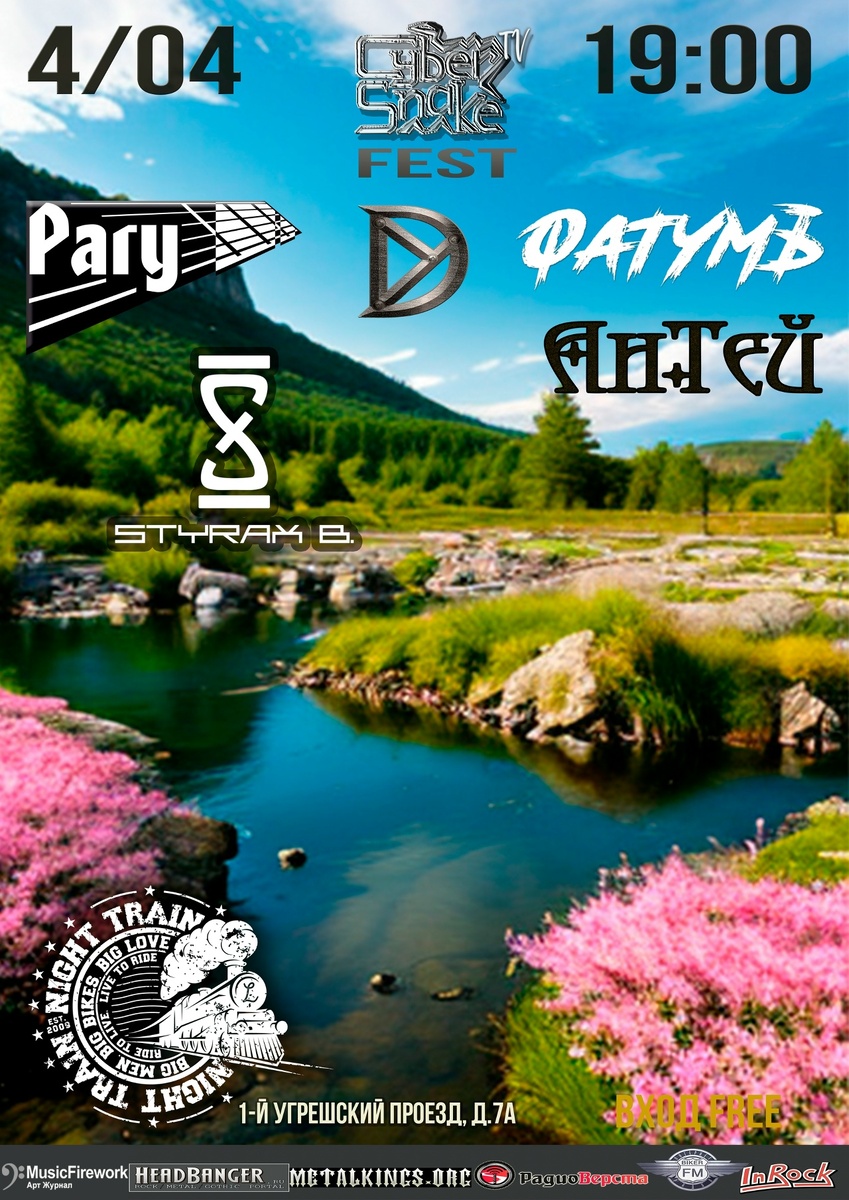 4 апреля в клубе Night Train состоится выступление РАГУ, Диспрозий, ФатумЪ, АнТэй и STYRAX B. Начало в 19.00. Вход свободный. Адрес: г. Москва, 1-й Угрешский пр., 9А, м. Угрешская. 16+
