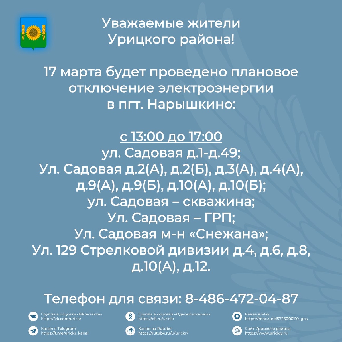 ! 📢 17 марта будет проведено плановое отключение электроэнергии в поселке Нарышкино. Все подробности в карточках ⬆ #УрицкийРайон #АдминистрацияУрицкогорайонаОрловскойобласти