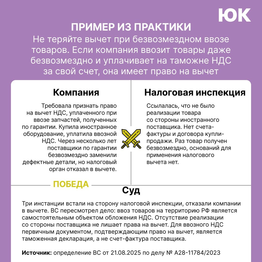 ➡️ Рассказали из-за каких ошибок бухгалтеров компании теряют право на вычет. Сложность в том, что такие ошибки долго остаются незаметными и проявляются только при проверке налоговой или в споре с контрагентом. Применяют к авансовому НДС «спецсрок», которого нет в НК: собирать документы заранее. Вычет НДС применяют не только к уже полученным товарам и услугам, но и к уплаченным авансам. Здесь бухгалтеры могут попасть в ловушку формальных сроков. Распространенное среди них мнение, что вычет по авансовому счету-фактуре нужно заявить строго в том квартале, когда был перечислен аванс, ошибочно. Общий трехлетний срок НК действует для заявления любых вычетов. Это правило относится и к авансам. Важна не дата получения счета-фактуры, а факт реализации. 📄 Рекомендуем согласовать с бухгалтерией и коммерческими подразделениями процесс информирования о завершении работ или отгрузке товаров по авансированным договорам. А авансовые счета-фактуры хранить в течение всего трехлетнего срока, в рамк