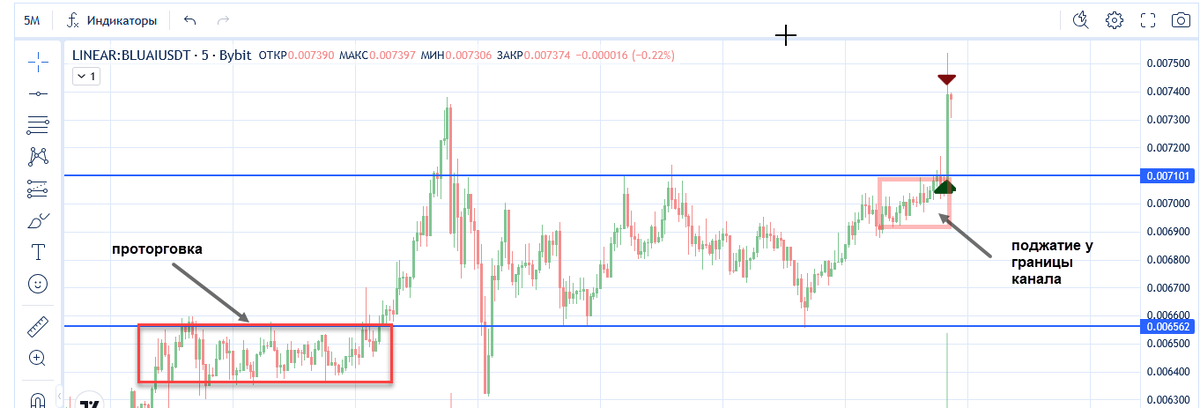 Сейчас на рынке высокая неопределенность и активные манипуляции. Поэтому классические стратегии плохо отрабатывают. Во всяком случае, у меня))… «Выносит» из сделки по несколько раз, а отрабатывает довольно редко. Пока такая ситуация, я чаще всего торгую просто импульсы на волатильных монетах. Это очень локальные пробои на активах, которые разгоняют. При этом беру только первый импульс и сразу выхожу. Если монета очень волатильная , то этот импульс может достигать десятков процентов. Но может сразу же за импульсом произойти сильный «откат». Это чисто скальперская торговля. Обычно длится секунды или единицы минут. Если у вас маленький опыт торговли с приводом, лучше в такие сделки не входить. Биржи часто даже предупреждают об опасности входа в такие сделки из-за высокой волатильности отдельных монет. Для примера – скрин сделки на монете BLUAI: Особенности торговли. В этой сделке я сразу взял 5,17%. Это хороший результат. В таких случаях я прекращаю торговлю в этот день, не смотря