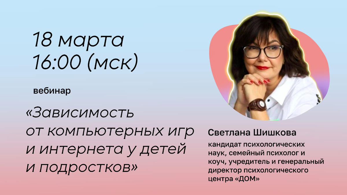 В прямом эфире кандидат психологических наук, семейный психолог и коуч, учредитель и генеральный директор психологического центра «ДОМ» Шишкова Светлана Юлиановна Онлайн-трансляция будет доступна на официальной странице Союза женщин России ВКонтакте. Вопросы спикеру оставляйте в комментариях, мы обязательно передадим их эксперту и ответим вам! Также вы можете поделиться мнением по вопросам интернет-зависимости у детей и подростков. Вебинар проходит в рамках социального проекта Союза женщин России «Интернет-портал «Женщины России». 📲 Друзья, подписывайтесь на сообщество Союза женщин России в МАКС! #сжр #союзженщинроссии #ИнтернетЗависимость