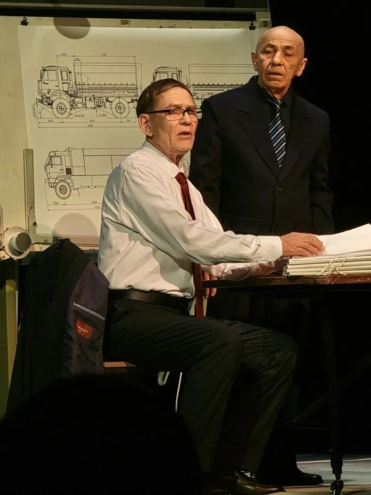 В спектакле появляются два очень важных образа. Один из них — директор автозавода, в котором легко угадываются черты Сергея Анатольевича Когогина. Второй — главный конструктор Данис Хадиевич Валеев, человек, стоявший у истоков разработки военной техники. Через этих героев проходит важная мысль: за каждой машиной, за каждым техническим решением стоят люди, их характер, ответственность и вера в своё дело.