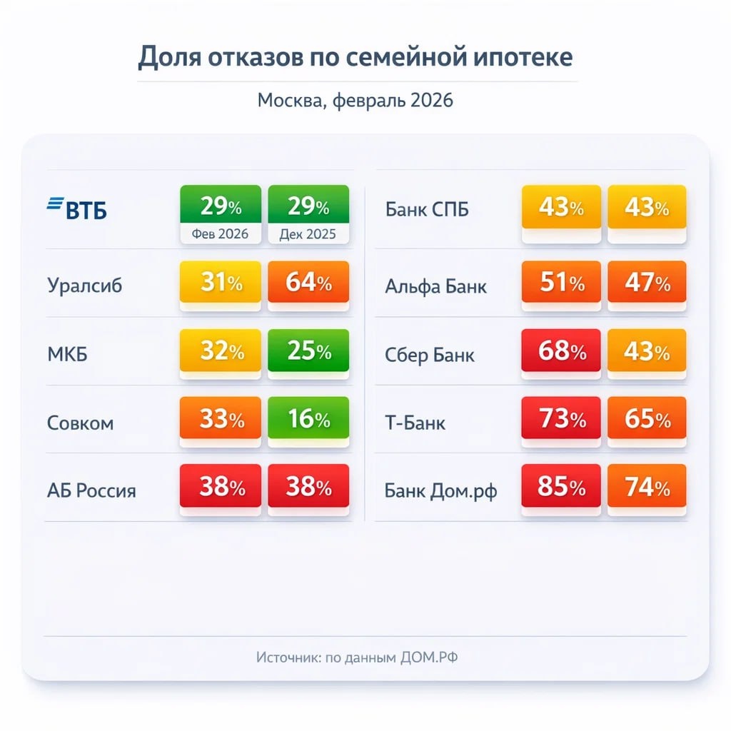 ? Наличие первоначального взноса, стабильного дохода и даже ребенка — увы, не гарантия одобрения. Банк смотрит глубже: кредитная история, долговая нагрузка, возраст, тип занятости и десятки внутренних скоринговых параметров. Вот как выглядит картина по Москве в феврале 2026? Самые требовательные банки: ДОМ.РФ — лидер антитопа: отказ получил 85% заявителей. Т-Банк — стабильно строгий: 73% отказов. При этом заявки продолжают подавать массово. Сбер неожиданно усилил фильтры: 68% отказов. В декабре ситуация была гораздо мягче. Самые лояльные банки: ВТБ — отказ всего 29%, одобрение получили около 71% клиентов. Уралсиб — показатель снизился до 31% (в декабре было 64%). МКБ — 32% отказов. Вывод простой: иногда правильный выбор банка экономит месяцы времени, десятки заявок и очень много нервов. И да, ипотека — это как свидание: важно не только понравиться банку, но и выбрать того, кто скажет «да».