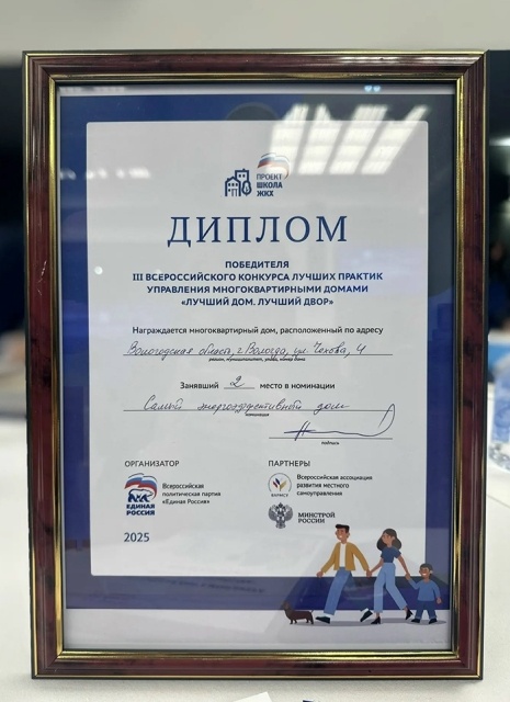 Конкурс проводится в рамках федерального проекта «Школа ЖКХ» и направлен на поддержку лучших практик управления многоквартирными домами и благоустройства дворовых территорий. По словам первого заместителя главы Вологды Юрия Сапожникова, победа дома стала результатом системной работы по внедрению современных технологий и повышению энергоэффективности здания. «Дом занял второе место в федеральном рейтинге в номинации «Самый энергоэффективный дом». И это не просто награда: за ней стоят реальные дела и современные технологии, которые уже оценили жители», — отметил Юрий Сапожников. По итогам конкурса многоквартирный дом на улице Чехова был удостоен диплома победителя. Награду получили вологжанки Ольга Бобрикова и Юлия Русинова. В городской администрации подчеркнули, что такие проекты становятся