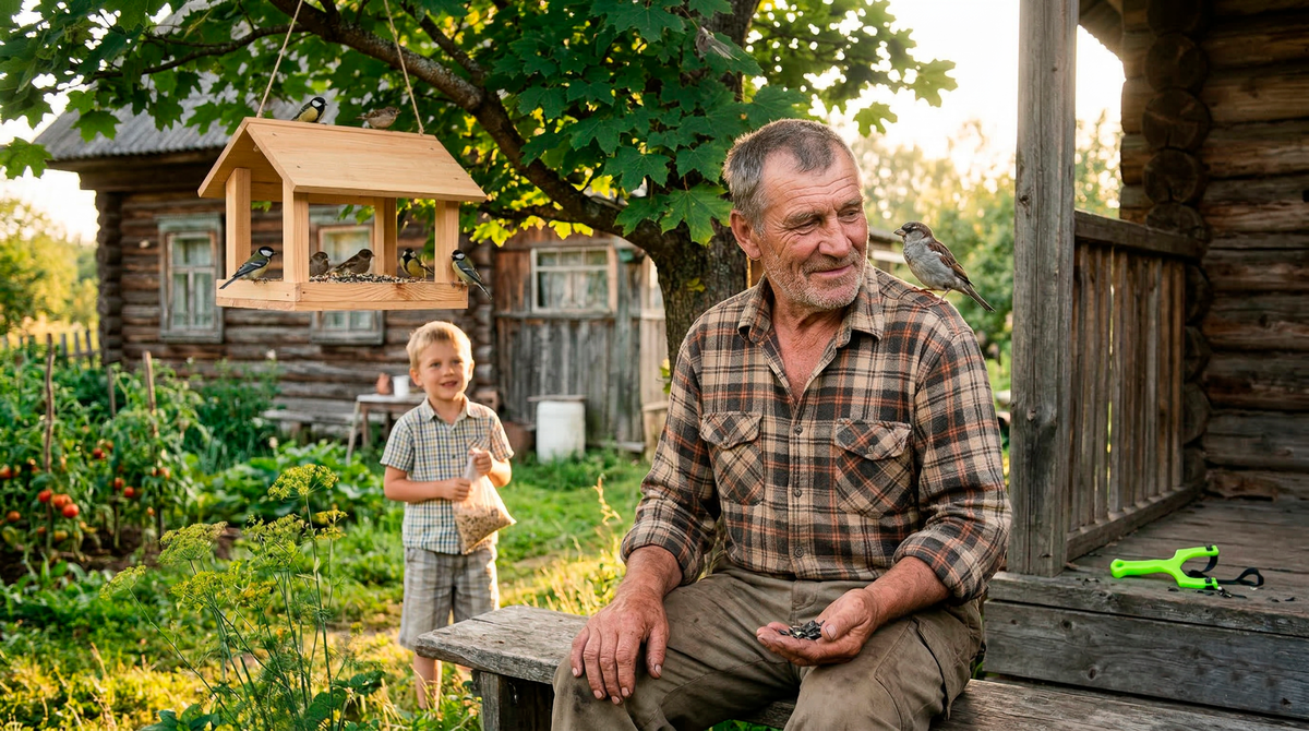 Когда на деревню опустились густые, бархатные синие сумерки, а в окнах соседских домов зажглись уютные жёлтые квадраты света, работа была полностью завершена. Дед и внук вышли из сарая во двор, бережно неся своё творение. Игнат принёс старую деревянную стремянку, установил её под тем самым раскидистым, морщинистым клёном и надёжно, на толстую медную проволоку закрепил новенькую, пахнущую свежей сосной кормушку на развилке толстых нижних ветвей. Стёпка сгонял в летнюю кухню, принёс большую стеклянную банку с отборными, нежареными подсолнечными семечками и щедро, до самых краёв наполнил деревянный поддон.
