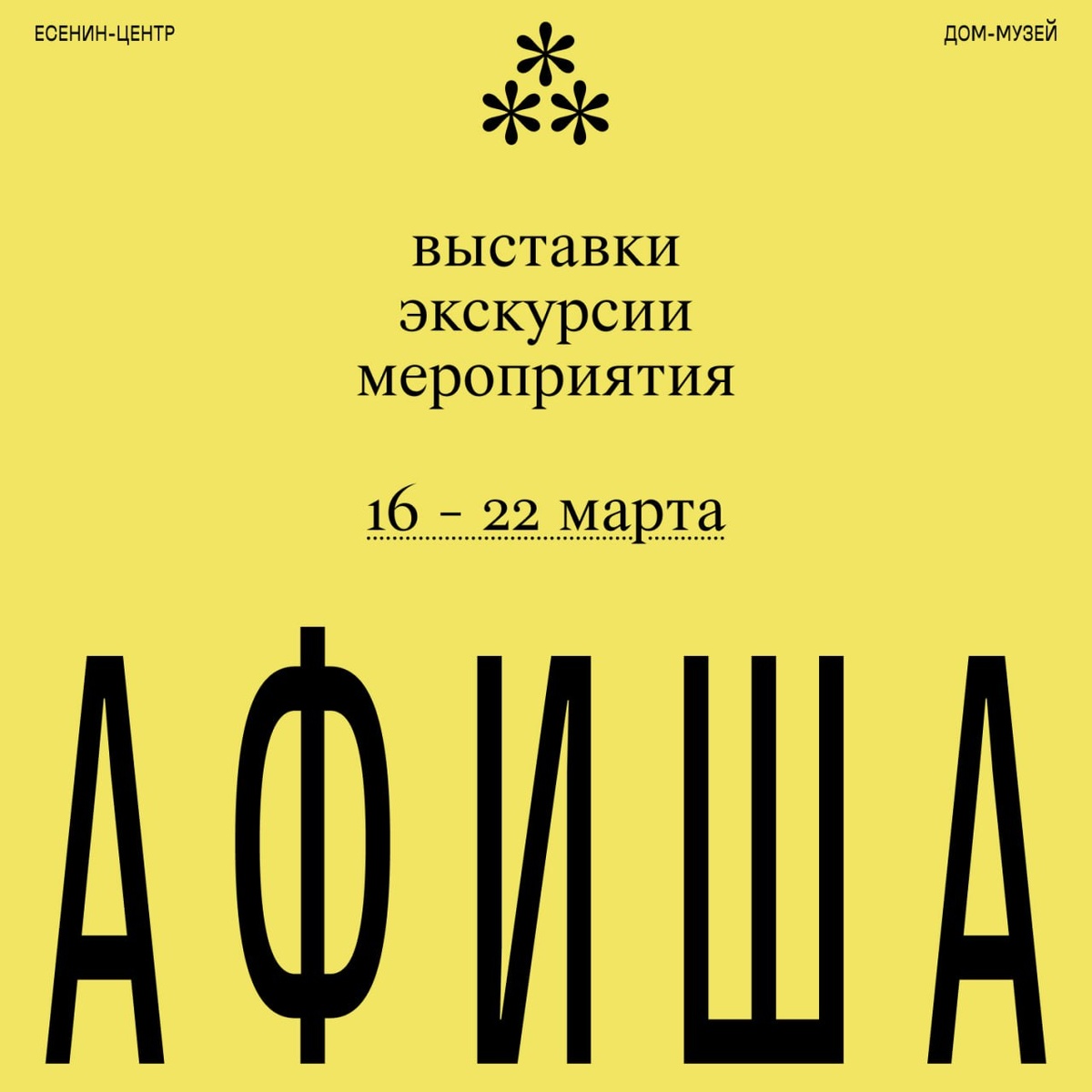 🍂🍂🍂🍂🍂 События в музее Есенина на неделю ВЫСТАВКИ: Есенин-центр (переулок Чернышевского, 4, стр. 2): ⚫️16-22 марта. Выставка "Черный человек. Исповедь поэта". ⚫️16-22 марта. Выставка "Поезд № 143". ⚫️16-22 марта. Выставка "Фронтовик Константин Есенин". Дом-музей С.А. Есенина (Большой Строченовский переулок, 24, стр. 2): 16-22 марта. Постоянная литературно-мемориальная экспозиция и выставка «Это все, что зовем мы Родиной…» МЕРОПРИЯТИЯ: Есенин-центр (переулок Чернышевского, 4, стр. 2): ⚫️19 марта в 19:00. Модный показ новой коллекции бренда ARKHIPOVA.MOSCOW в рамках Московской недели моды. ⚫️19 марта в 19:30. Мастер-класс «Черный человек в мире супрематизма». По предварительной записи: +79296167182 (Вероника). ⚫️21 марта. Всемирный день поэзии. ⚫️22 марта в 19:00. Спектакль "Дункан. Есенин". ЭКСКУРСИИ: Есенин-центр (переулок Чернышевского, 4, стр. 2): ⚫️19 марта в 18:30. "Я один… И разбитое зеркало". Специальная экскурсионная программа к выставке «Черный человек. Исповедь п