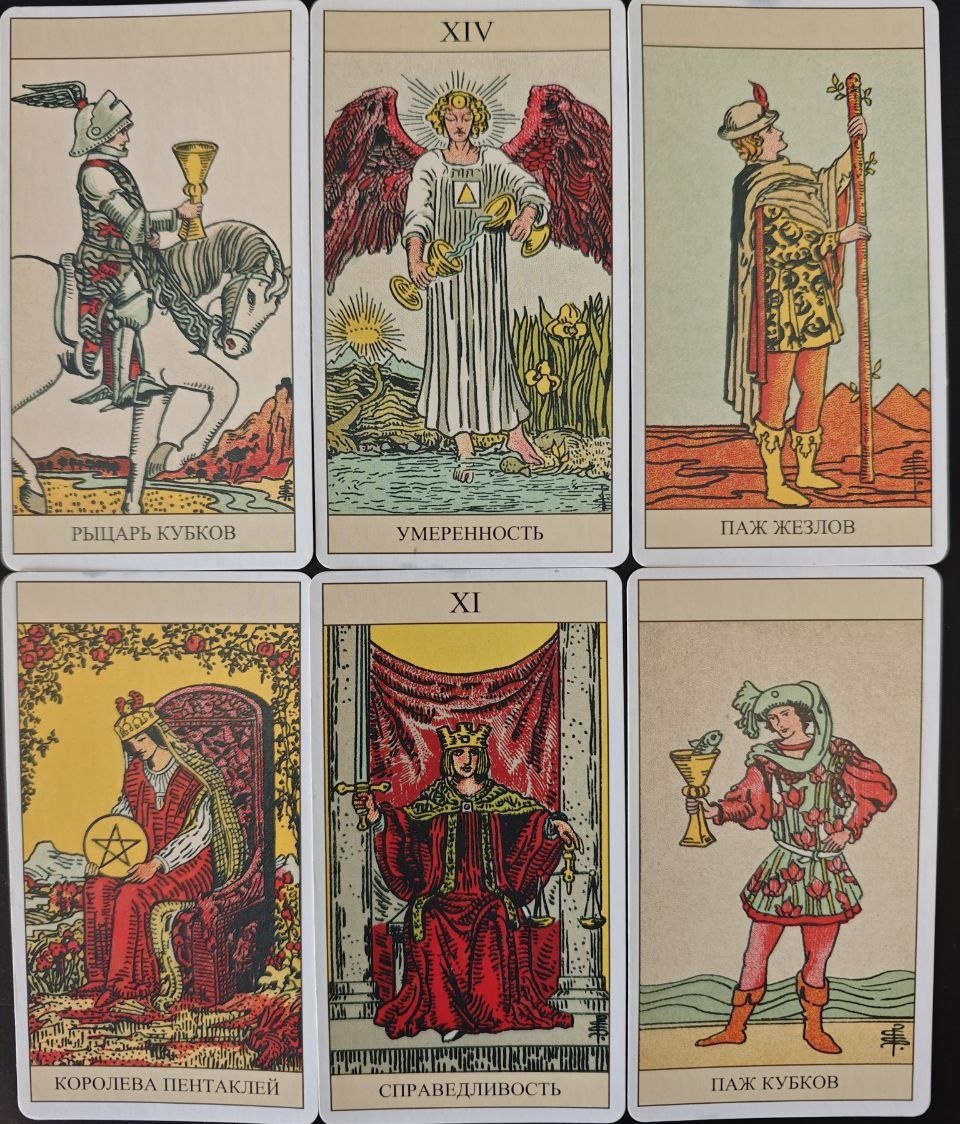 Карты: Рыцарь Кубков, Умеренность, Паж Жезлов, Королева Пентаклей, Справедливость, Паж Кубков