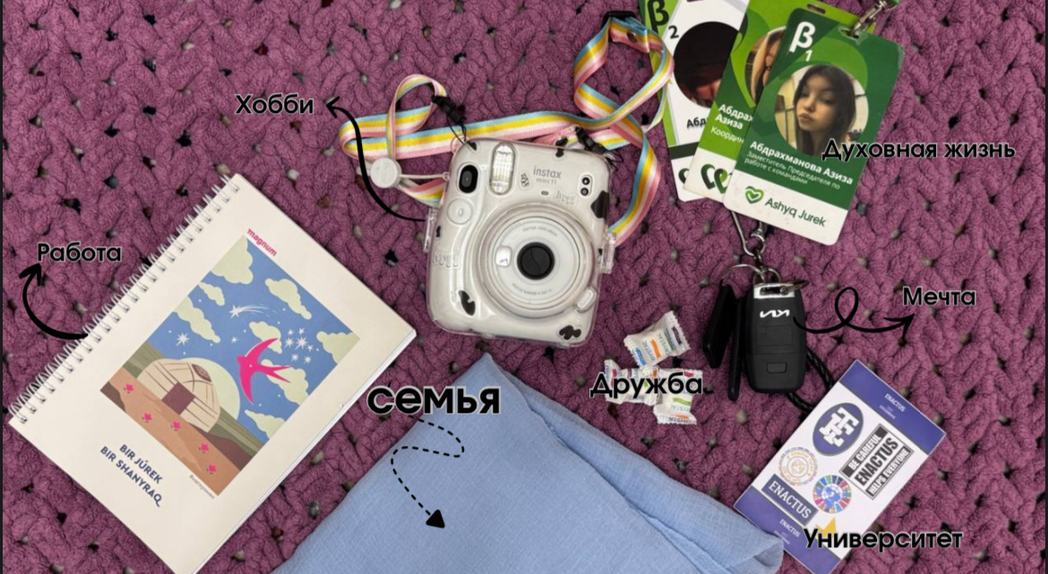 Мой натюрморт лежит на фиолетовом пледе, который связала мама. Набор предметов неслучаен. Каждый из них - часть моей жизни, моей личности и того, что придает моей жизни смысл каждый день. Эти вещи простые, но для меня они живые, потому что хранят в себе мои эмоции и воспоминания. Семья Этот светло-голубой платок моя бабушка надевает на праздники. В такие дни мы собираемся всей семьёй вместе за столом, смеемся, накладываем друг другу еду, заботимся друг о друге. Обычно бабушка готовит по знаменательным датам лагман. Праздничное блюдо ставится в центре стола. И мы дружно начинаем его уплетать. Семья для меня - это про любовь, поддержку и традиции, которые делают меня тем, кто я есть. Моя черная машина KIA -это не просто свобода и скорость. Это то, что заработано своим трудом. Два года я шла к этому моменту: училась, сдавала экзамены, получала права. Когда впервые взяла ключи в руки и села за руль, для меня ничего не существовало вокруг - только я и моя самостоятельность, дорога. Теперь